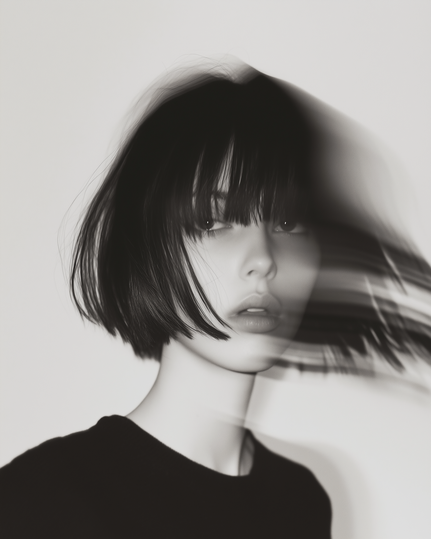 Dynamic black and white portrait of a young woman with a bob haircut, capturing motion and expression in a striking composition.