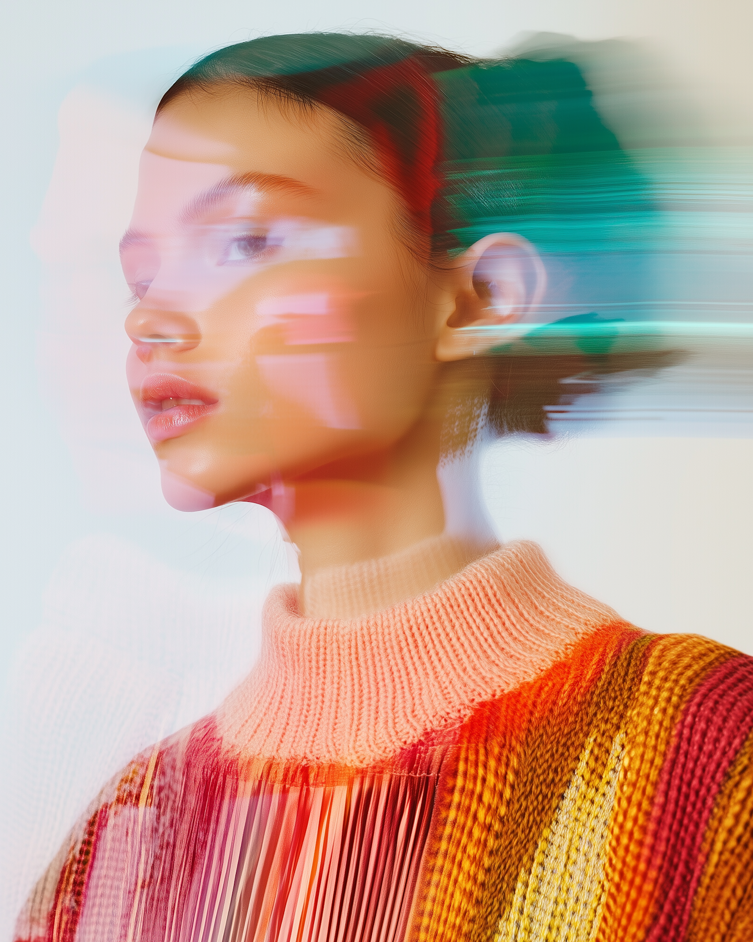 Artistic portrait of a young woman in a colorful knit sweater, featuring dynamic motion blur and vibrant hues.