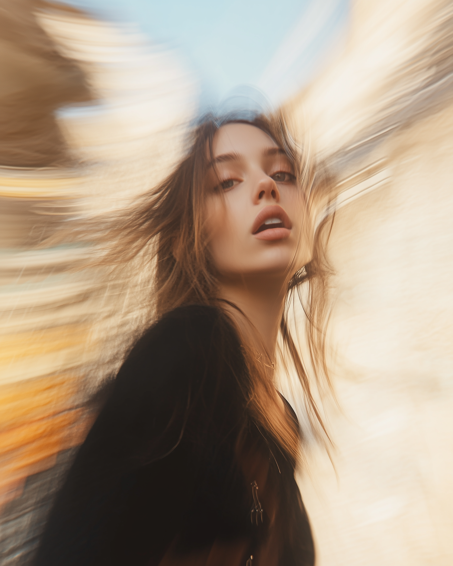 Dynamic portrait of a young woman with flowing hair and blurred background, creating a dreamlike, ethereal effect.