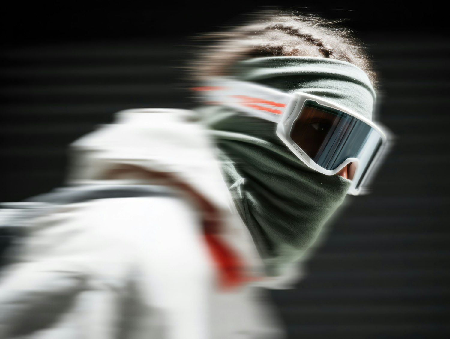 Dynamic image of a person in motion wearing a green face covering, white goggles, and a light jacket, set against a blurred dark background.