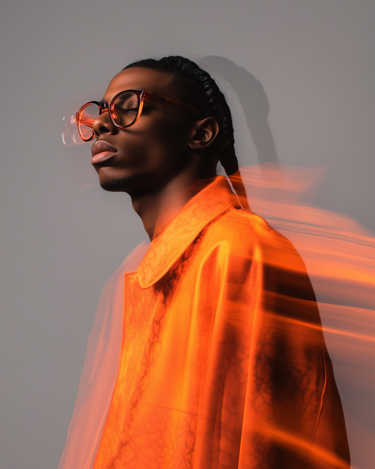 Stylish portrait of a man in orange glasses and jacket, with motion blur adding a dynamic, artistic touch to the vibrant composition.