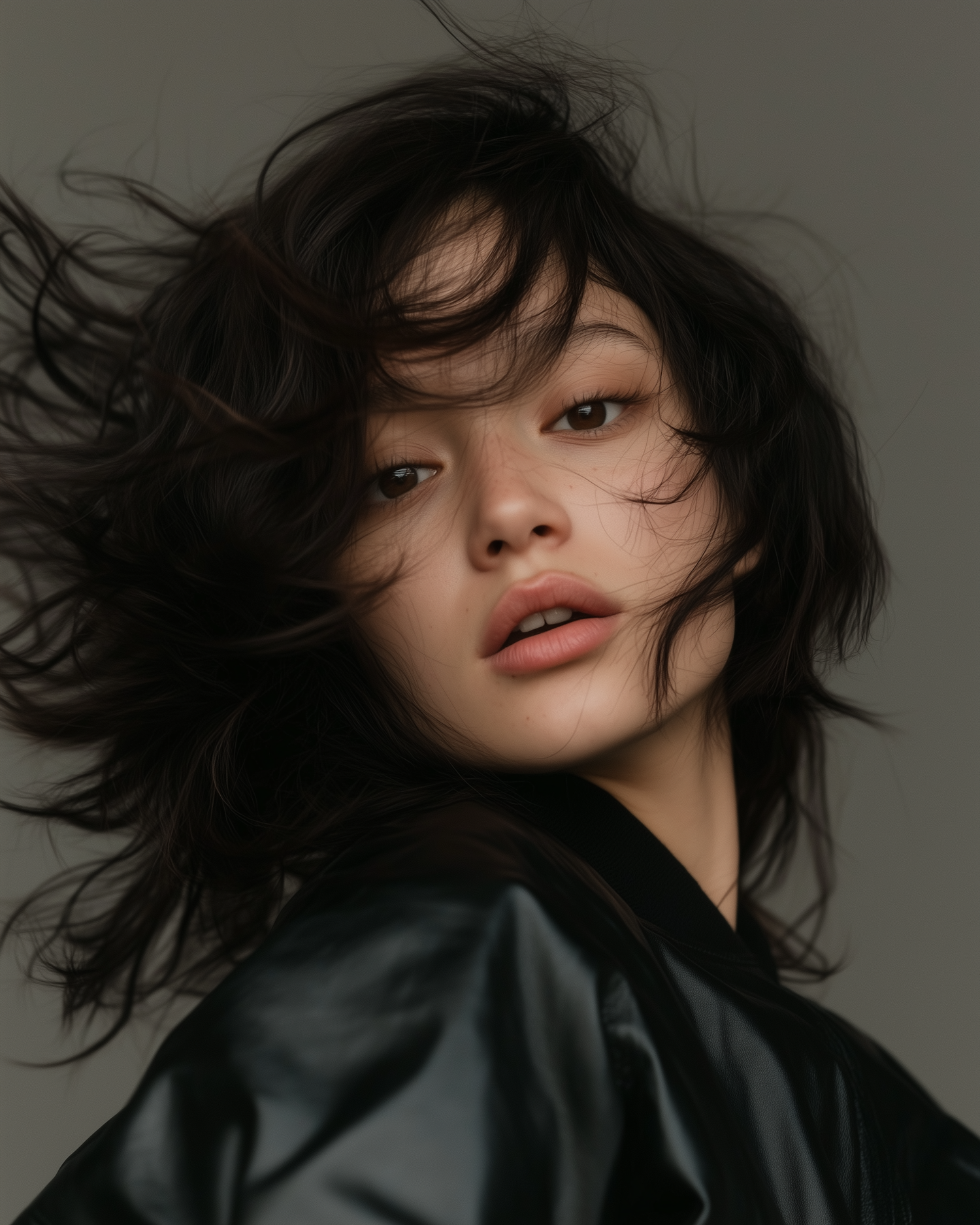 Dynamic close-up of a young woman with wavy dark hair, expressive brown eyes, and a black leather jacket against a neutral gray background.