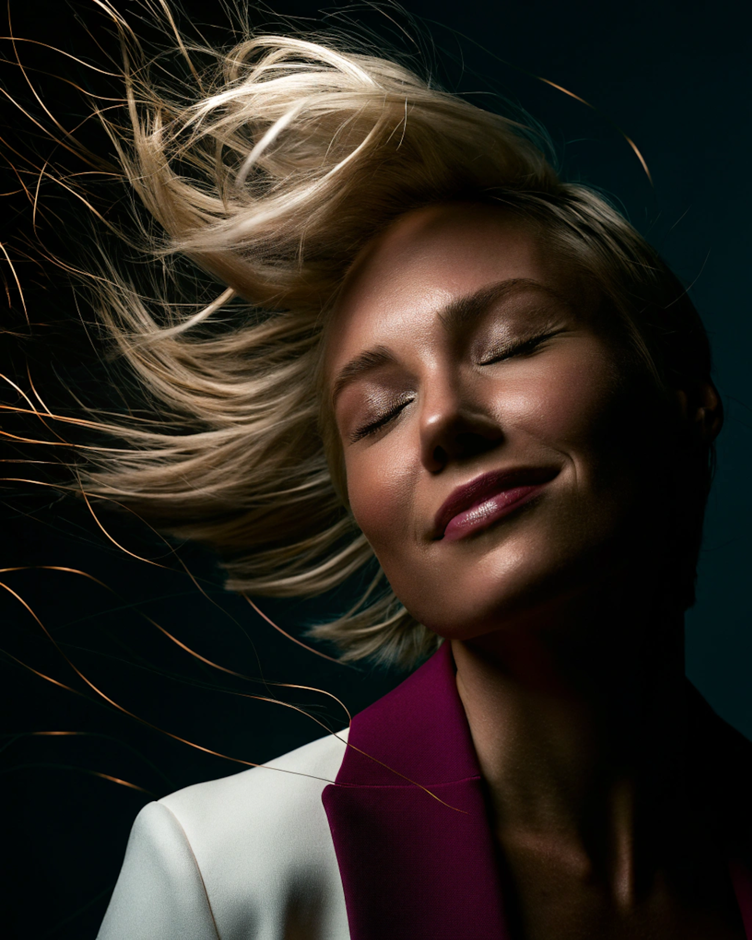 A striking portrait of a woman with blonde hair swept back, closed eyes, and a serene expression, wearing a white blazer with a magenta collar.