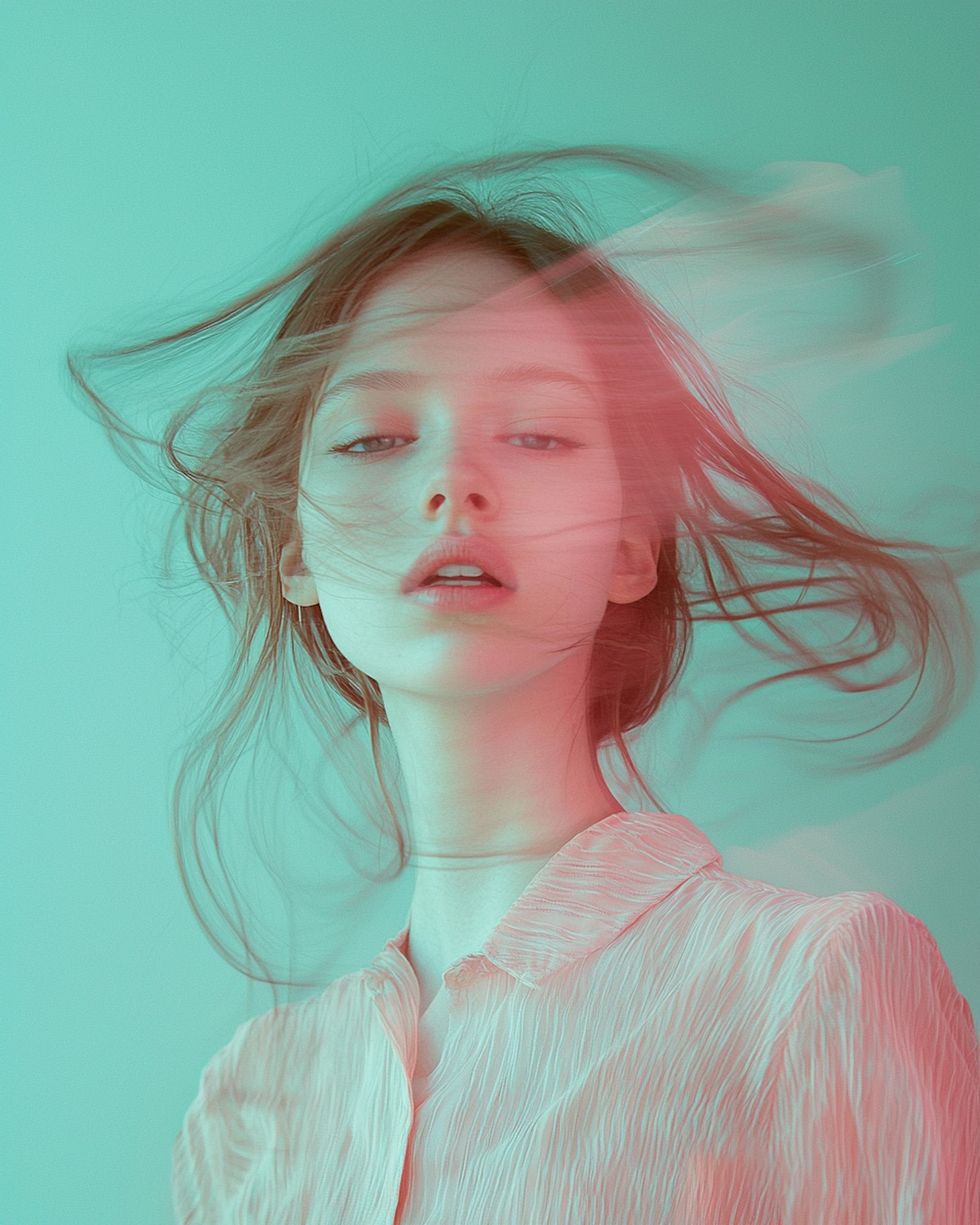Dynamic portrait of a young woman with flowing hair, a pink blouse, and a teal background, creating a dreamy, ethereal vibe.