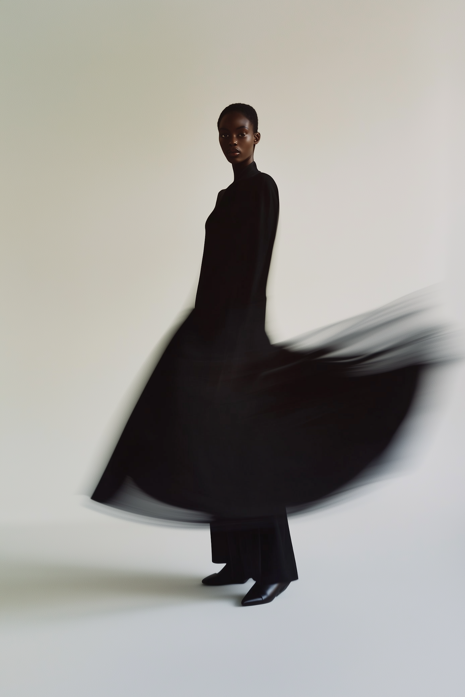 Elegant Black woman in a flowing black dress, captured in motion against a light background, exuding grace and poise.