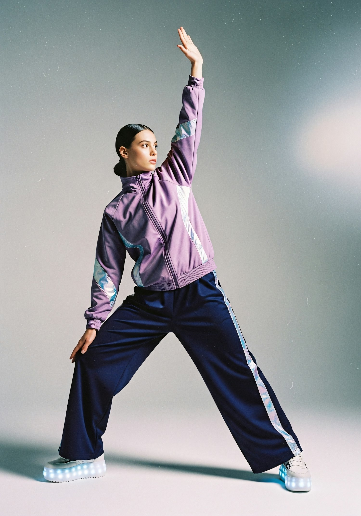 A person in a purple and navy tracksuit strikes a dynamic pose, wearing glowing platform shoes against a soft gray background.