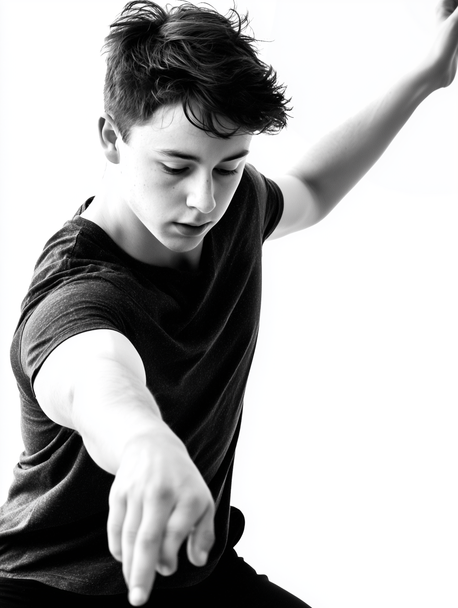 Black and white portrait of a young man in a dynamic pose, wearing a dark shirt, with a focused expression and tousled hair.