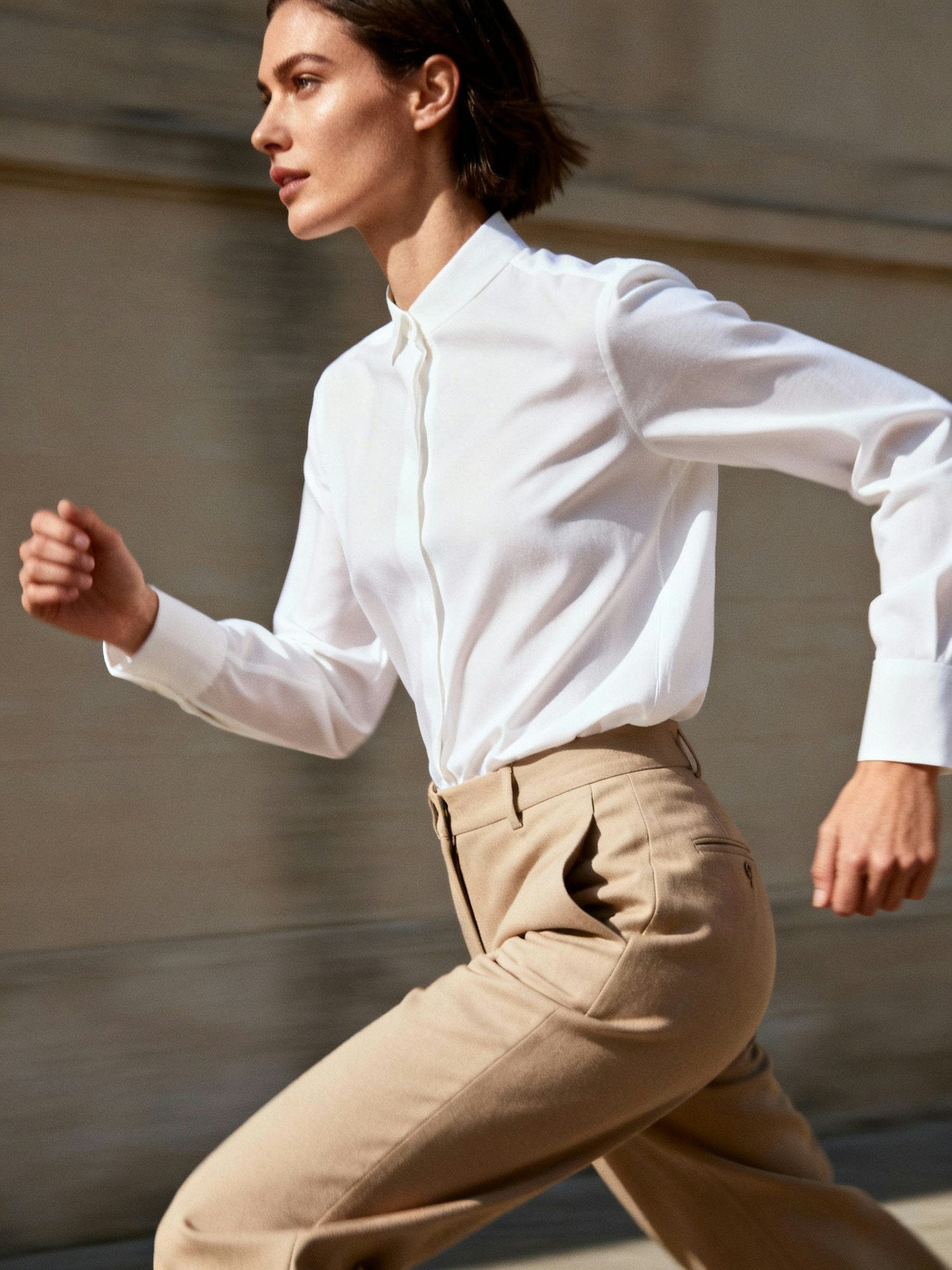 A woman in a white shirt and beige trousers is captured in motion, exuding a professional and dynamic vibe.