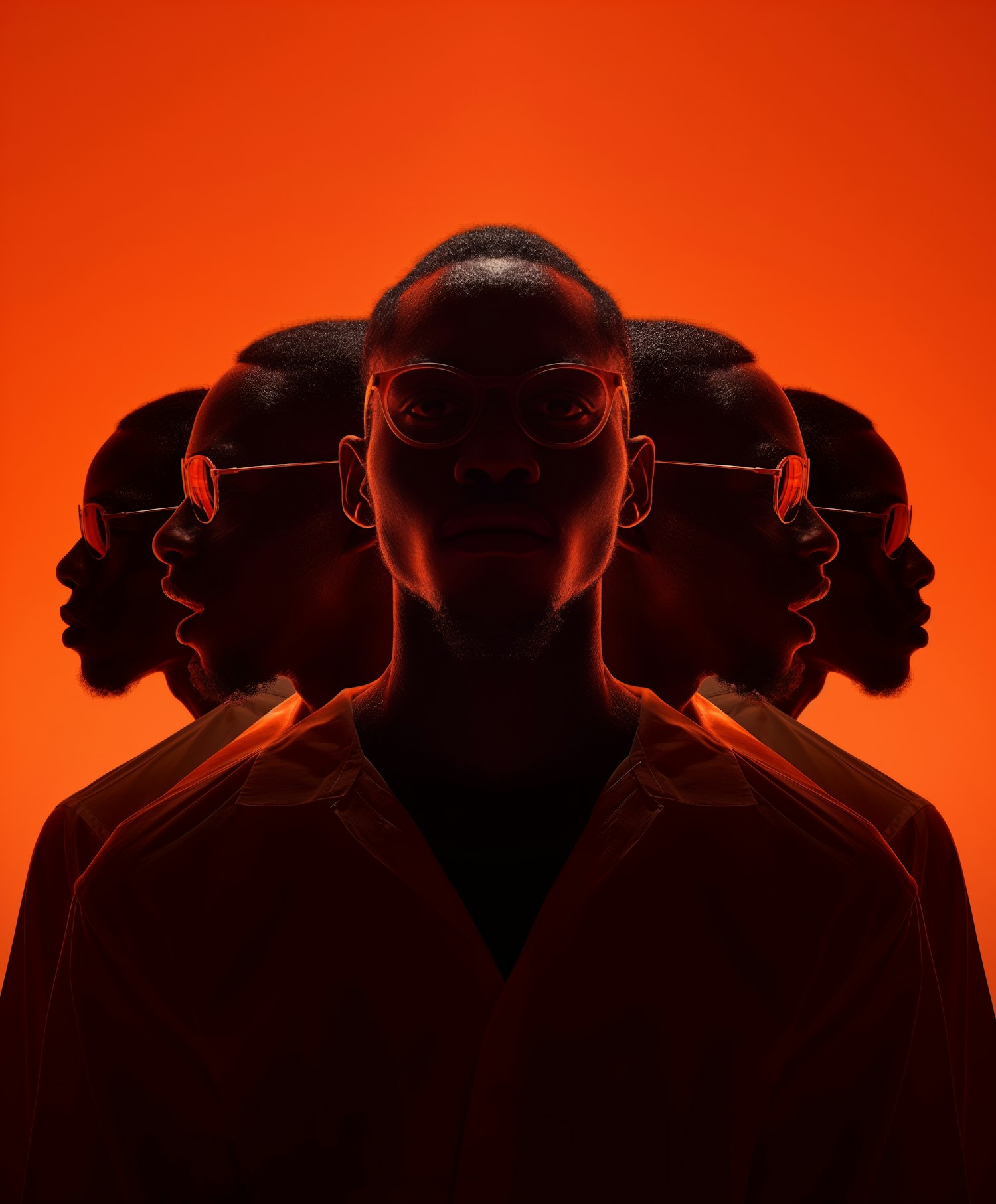 A dynamic portrait of a man with overlapping profiles against a vibrant orange background, creating a striking and artistic visual effect.
