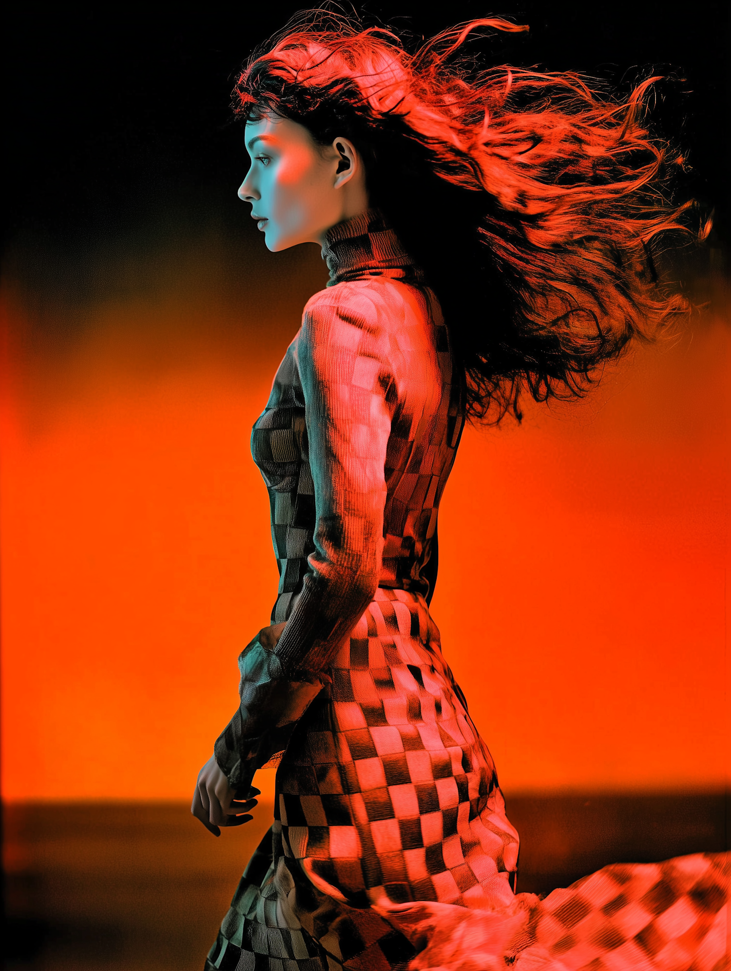 A woman in a checkered dress with flowing hair, set against a vivid red and orange background, creating a dynamic and artistic scene.