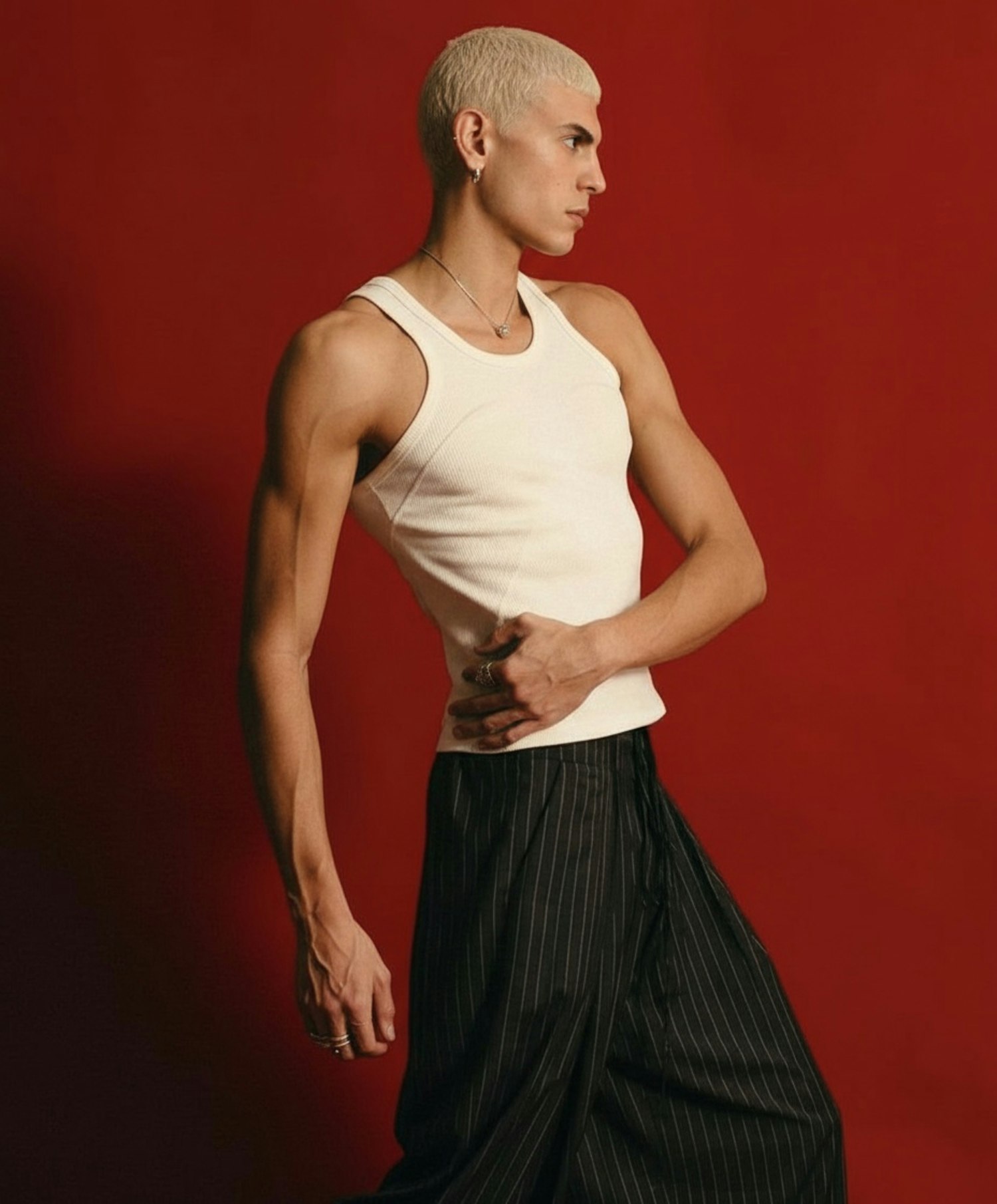 A stylish individual poses in a white tank top and pinstriped pants against a bold red background, showcasing a modern and confident look.