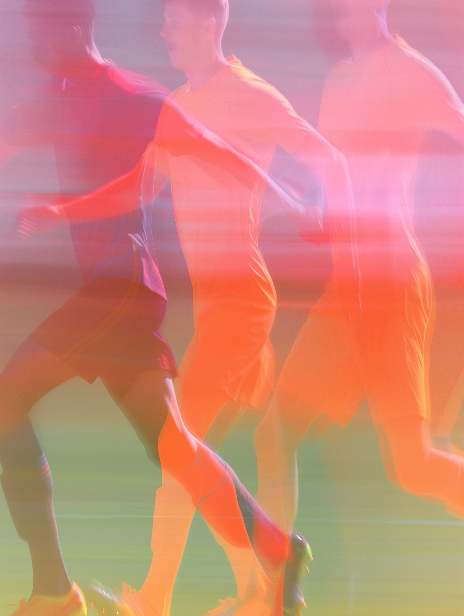 Dynamic motion blur of three athletes running, with vibrant red and orange hues creating an energetic and stylized effect.