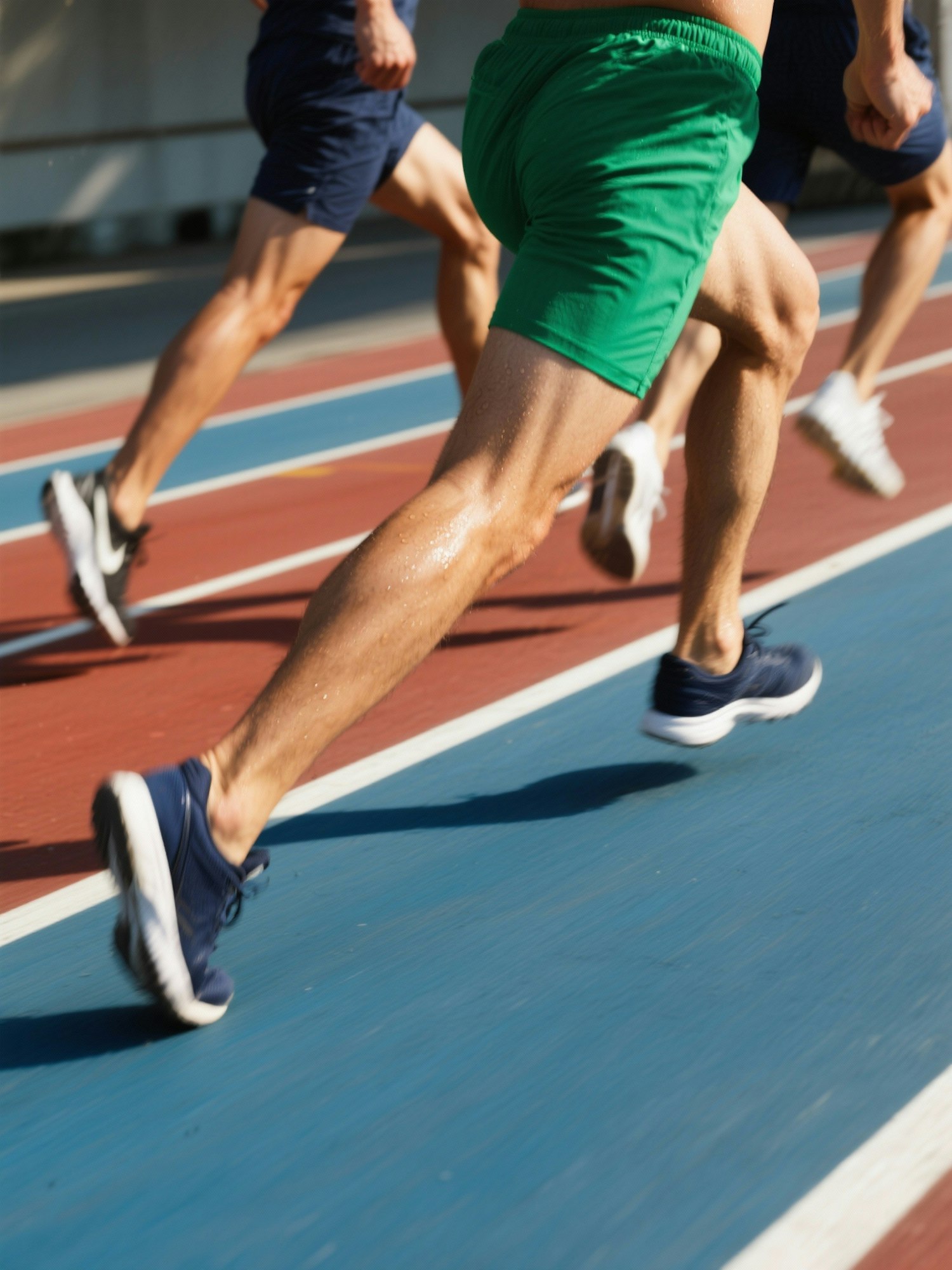 Highly realistic editorial photography, runners in motion, intense daylight, urban environment, dynamic blur, strong contrast, cinematic framing, close-up energy, sporty fashion, aesthetic and modern style, natural colors with metallic accents, editorial sports magazine look. Close-up of the lower bodies of two runners sprinting on a track. Defined legs in motion, sweat glistening. One wears lime green shorts and navy shoes, the other navy shorts and white shoes. The ground shows blurred red and blue lanes with white dividing lines. Strong sunlight highlights every muscle detail.
