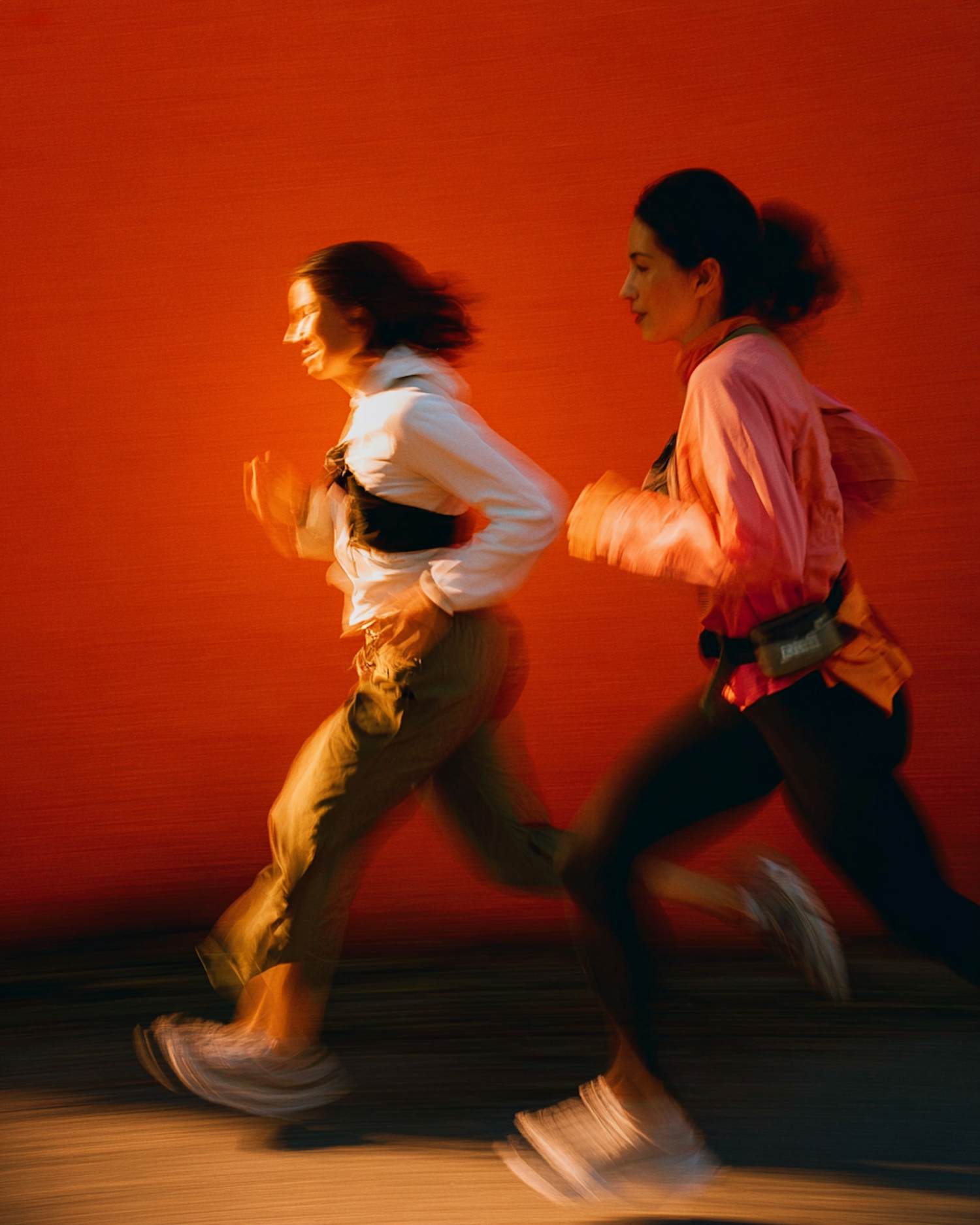 Two people running energetically against a bright orange background, dressed in activewear, with motion blur emphasizing their speed.