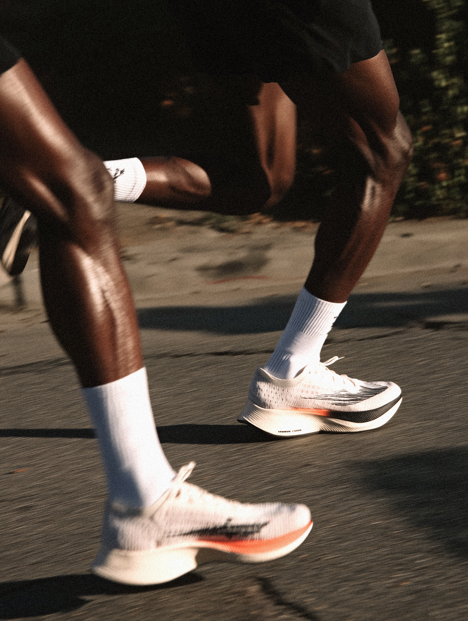 Close-up of runners' legs in motion, wearing white athletic shoes with orange accents and white socks, captured in dynamic lighting.