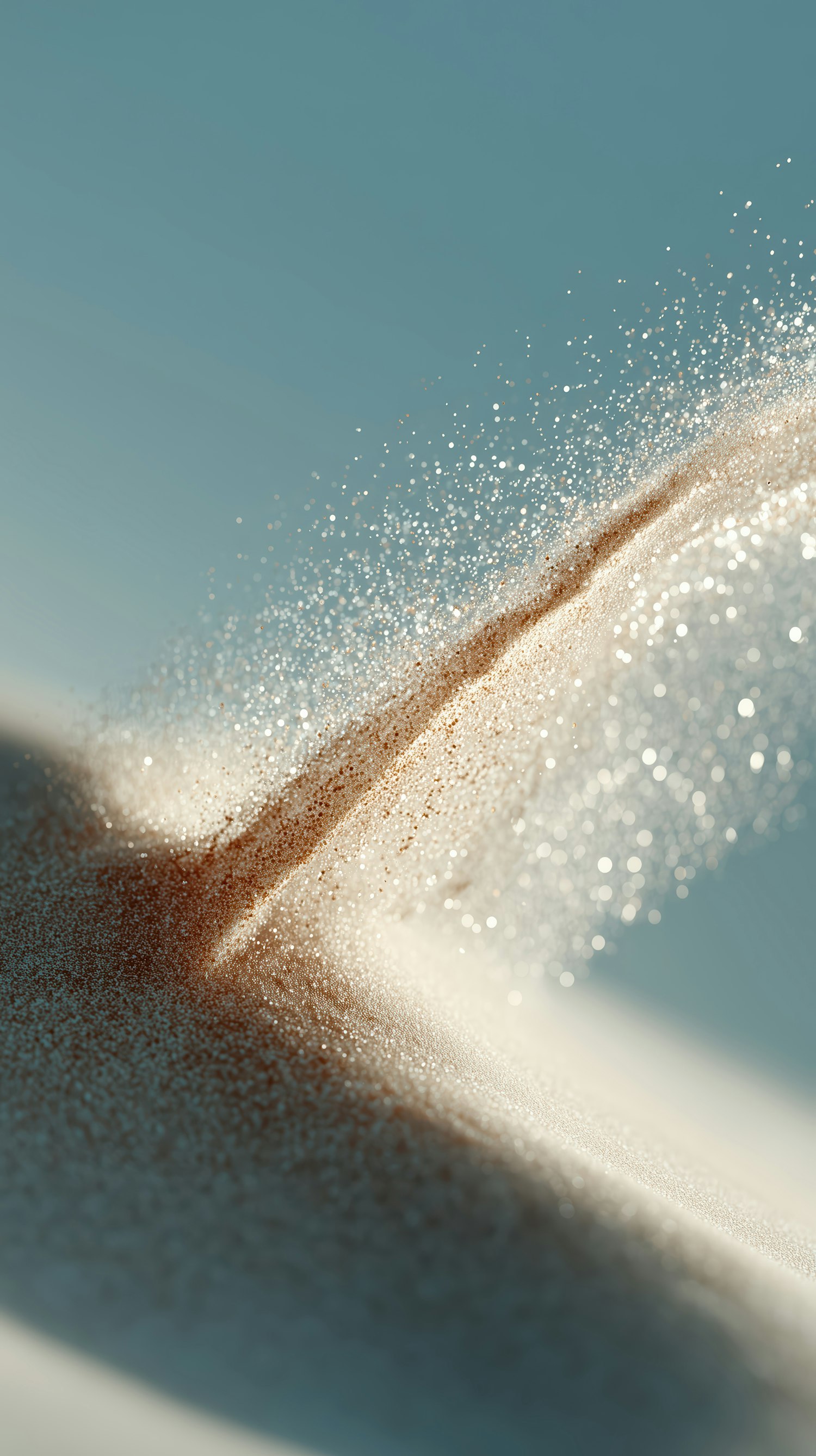 Dynamic close-up of sand particles scattering in soft light, creating a sparkling effect against a smooth blue gradient background.