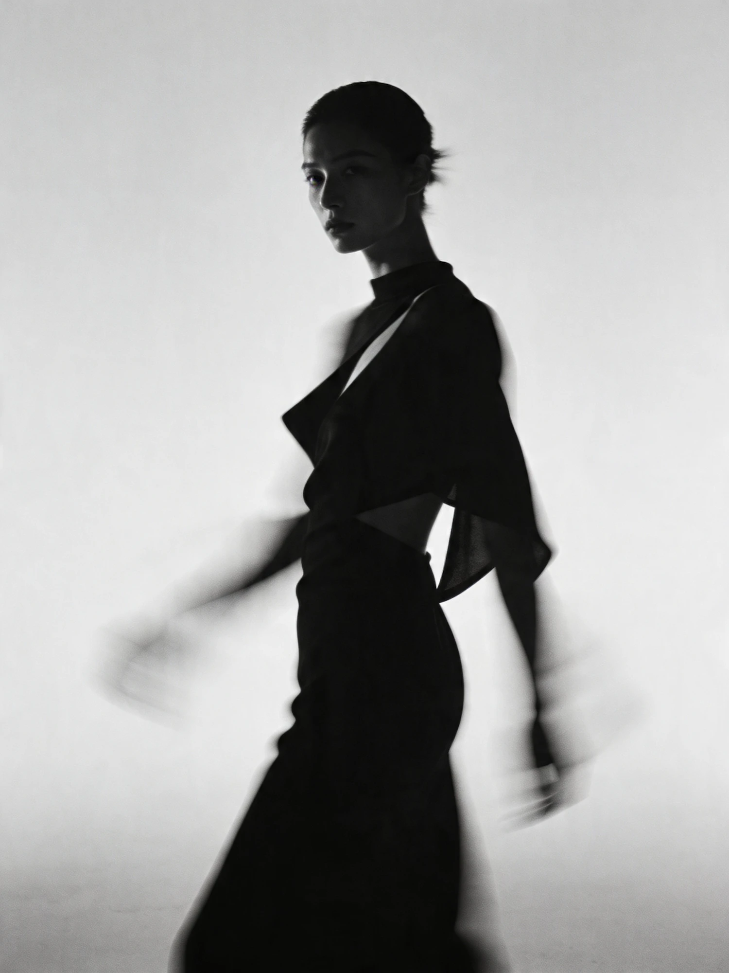 A single‑tone silhouette captured mid‑movement, soft blur fragments, sleek styling, quiet avant‑garde elegance.