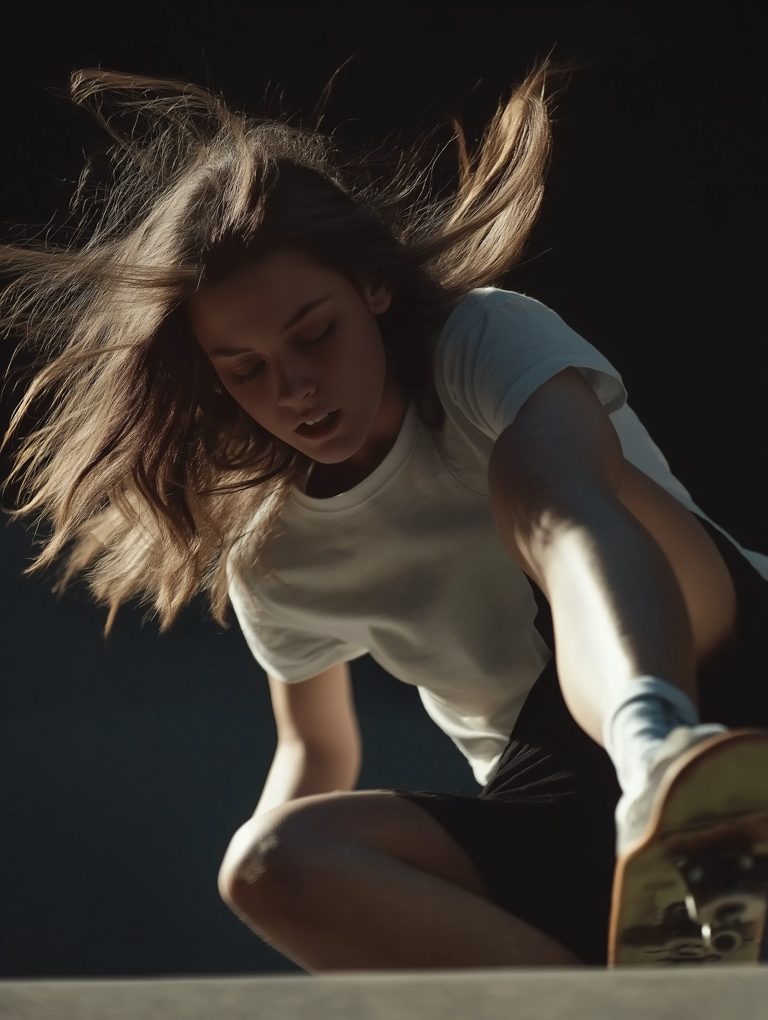 Dynamic shot of a young woman skateboarding, her hair flowing in motion, wearing a white t-shirt and black shorts against a dark background.