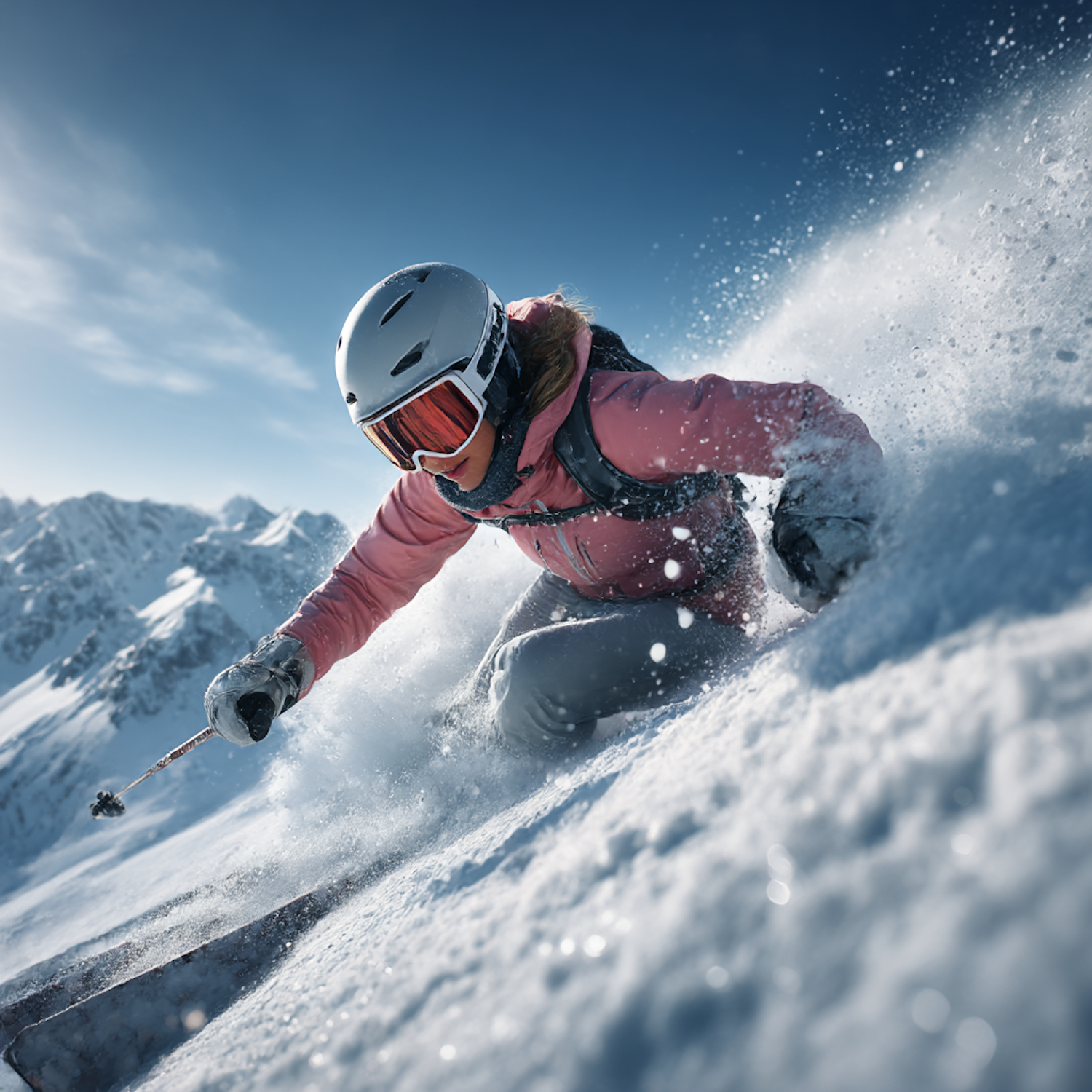 A skier in a pink jacket and white helmet carves through fresh snow on a sunny mountain slope, with snowy peaks in the background.