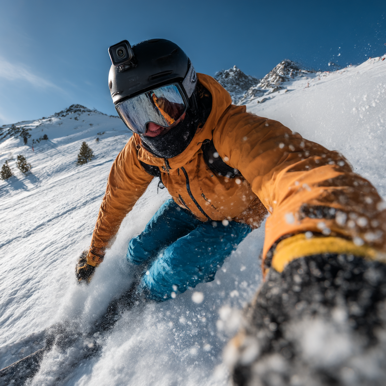 A skier in an orange jacket and blue pants carves through fresh snow on a sunny mountain slope, with a camera mounted on their helmet.
