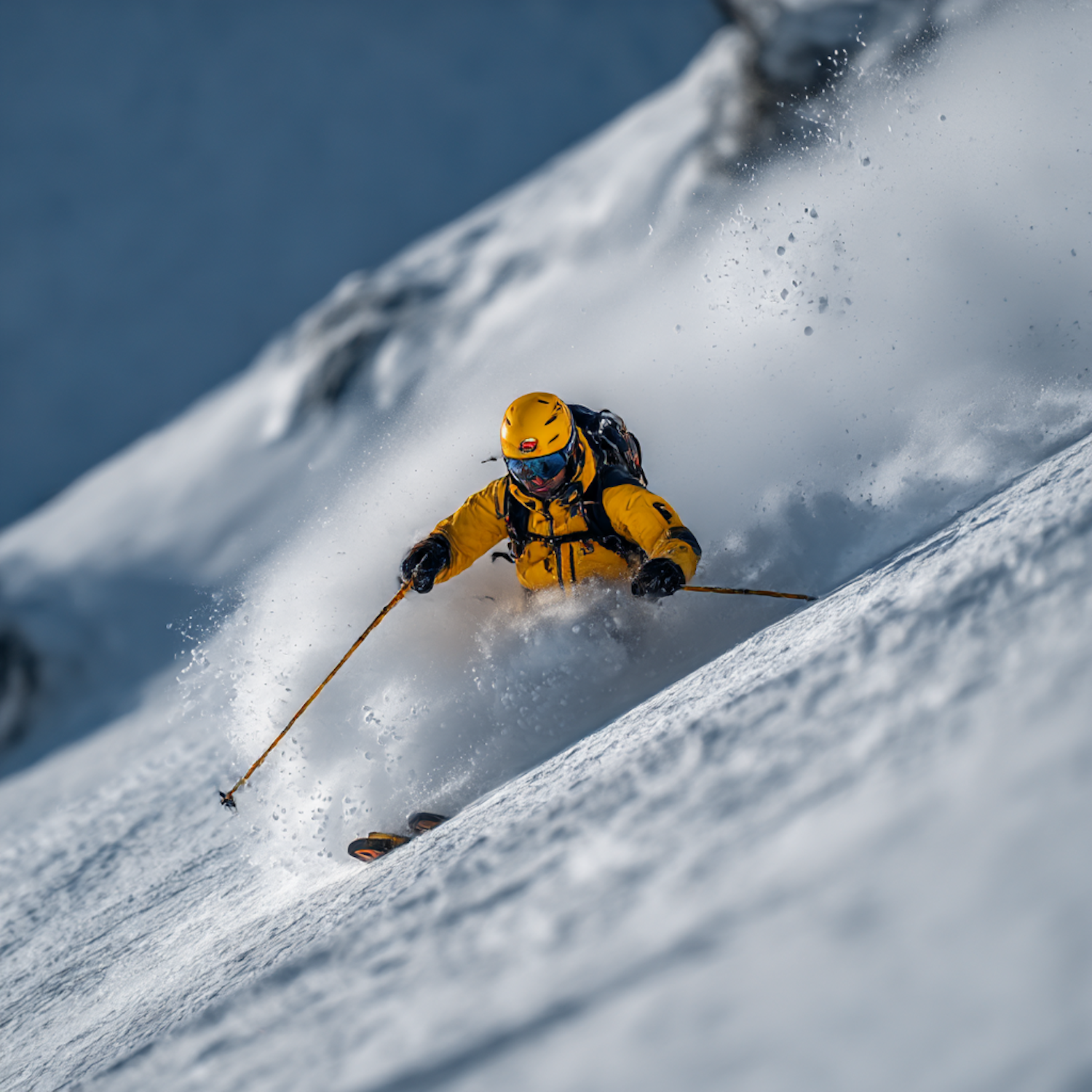 A skier in a yellow jacket and helmet carves through fresh snow on a steep slope, surrounded by a spray of powder under clear skies.