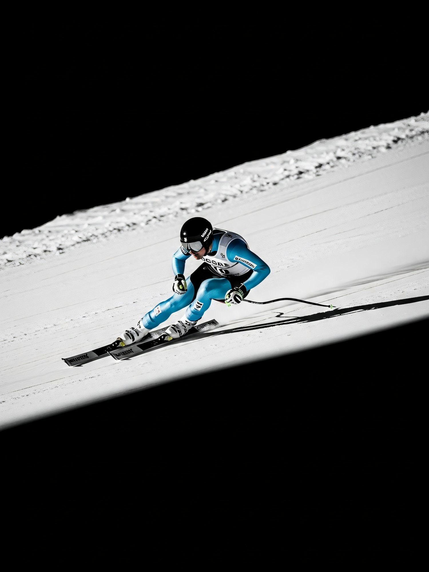 A skier in a blue racing suit leans into a turn on a snowy slope, set against a dramatic black background.