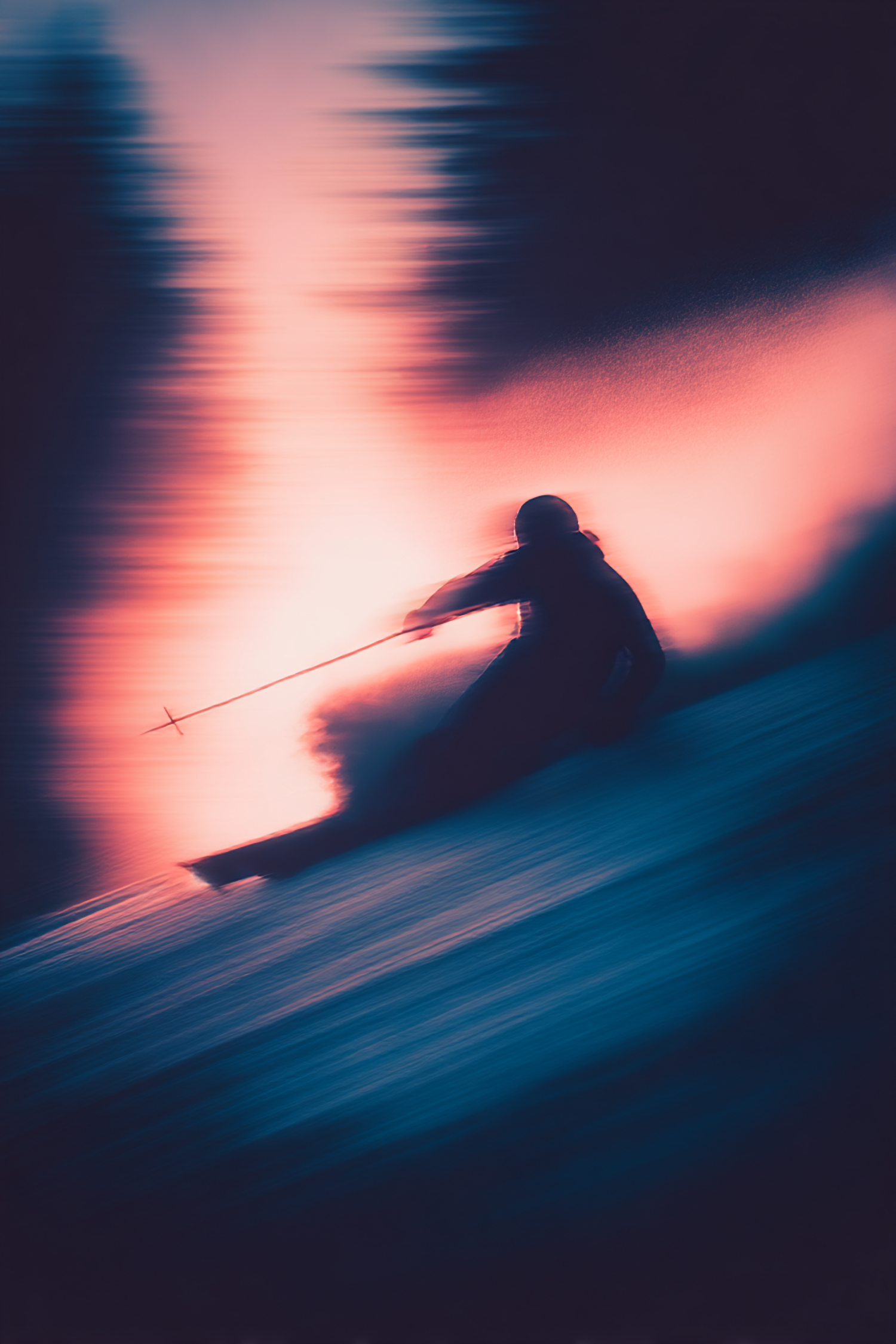 Dynamic shot of a skier in motion, with vibrant orange and blue tones creating a dramatic and energetic atmosphere.