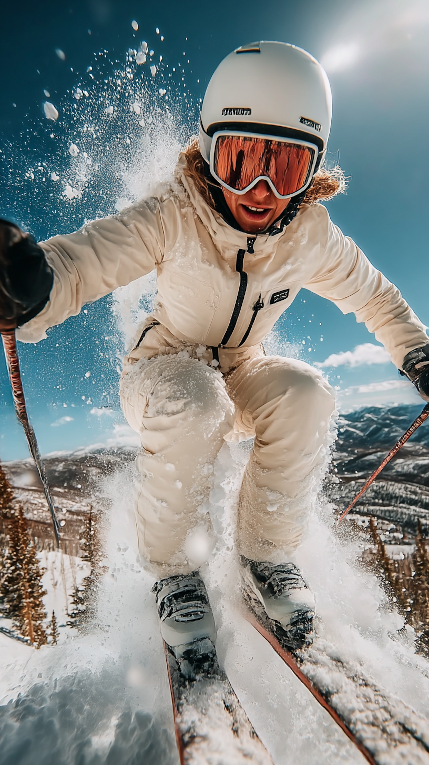 Dynamic action shot of a skier in a white suit and helmet, descending a snowy slope with a mountain backdrop and clear blue sky.