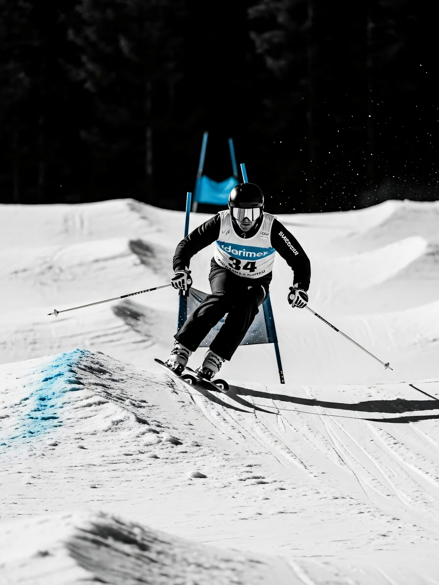A skier in action on a snowy slope, wearing a helmet and goggles, navigating a downhill course marked by blue flags. Dynamic and striking.