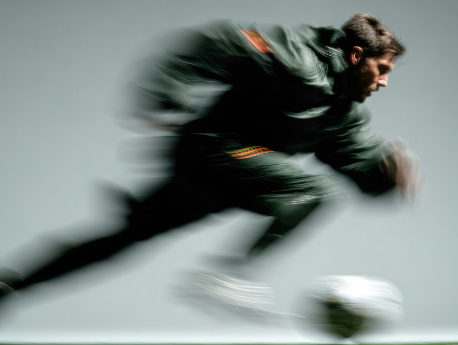 A blurred action shot of a man running towards a soccer ball, emphasizing speed and motion with a neutral background.