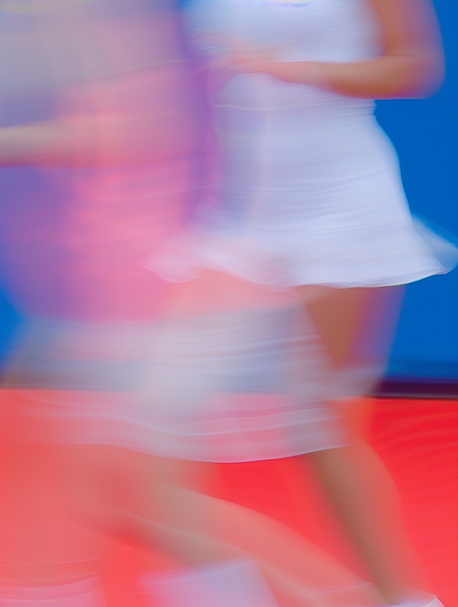Blurred motion of two individuals in vibrant red, pink, and white tones, suggesting dynamic sports action on a colorful court.