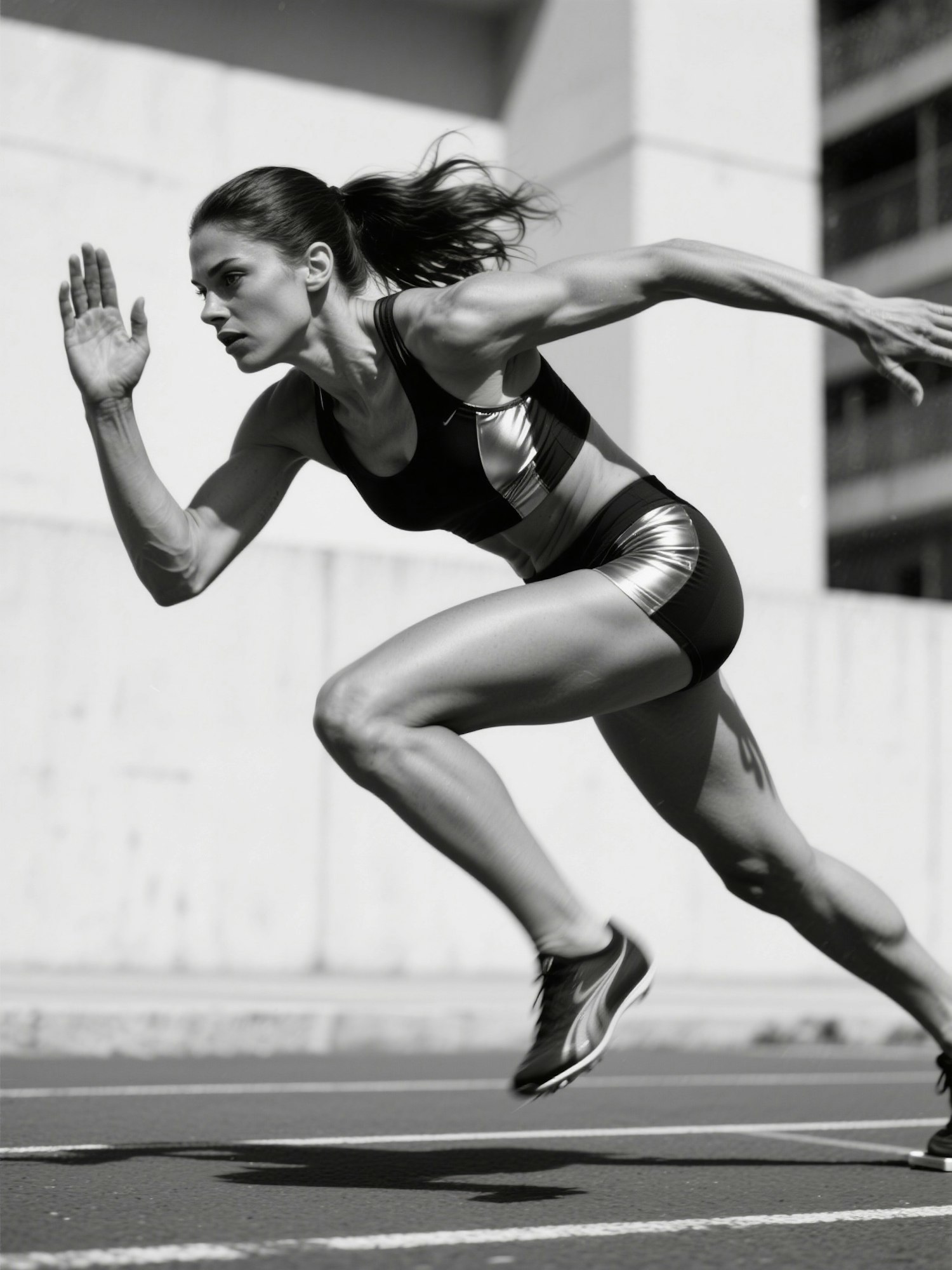 Highly realistic editorial photography, runners in motion, intense daylight, urban environment, dynamic blur, strong contrast, cinematic framing, close-up energy, minimal background, sporty fashion, aesthetic and modern style, natural colors with metallic accents, editorial sports magazine look. Black and white shot of a female athlete in explosive sprint start, body stretched forward mid-air, muscles defined, dramatic shadows, minimalist clean background, intense focus on energy.