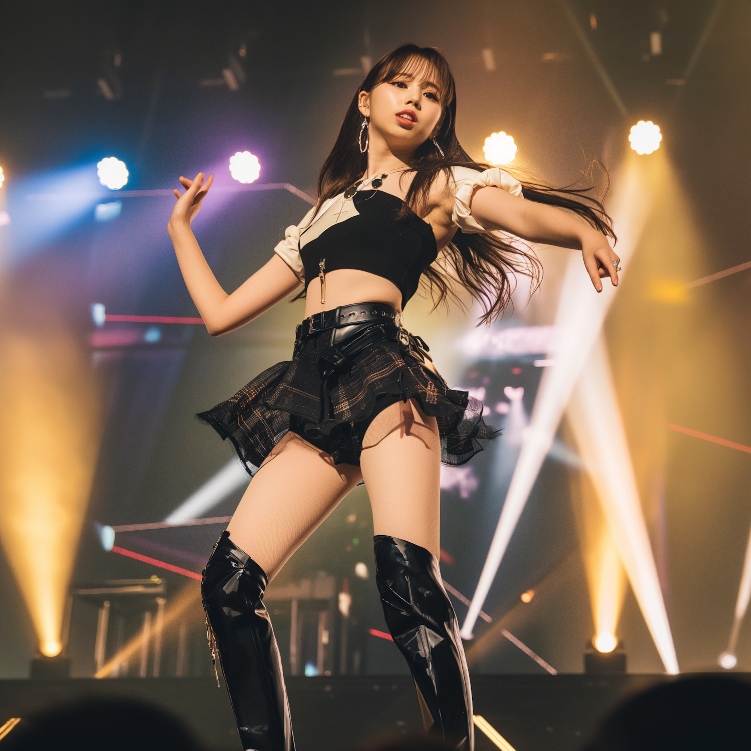 Energetic performance by a woman in stylish attire on a vibrant stage with colorful lights.