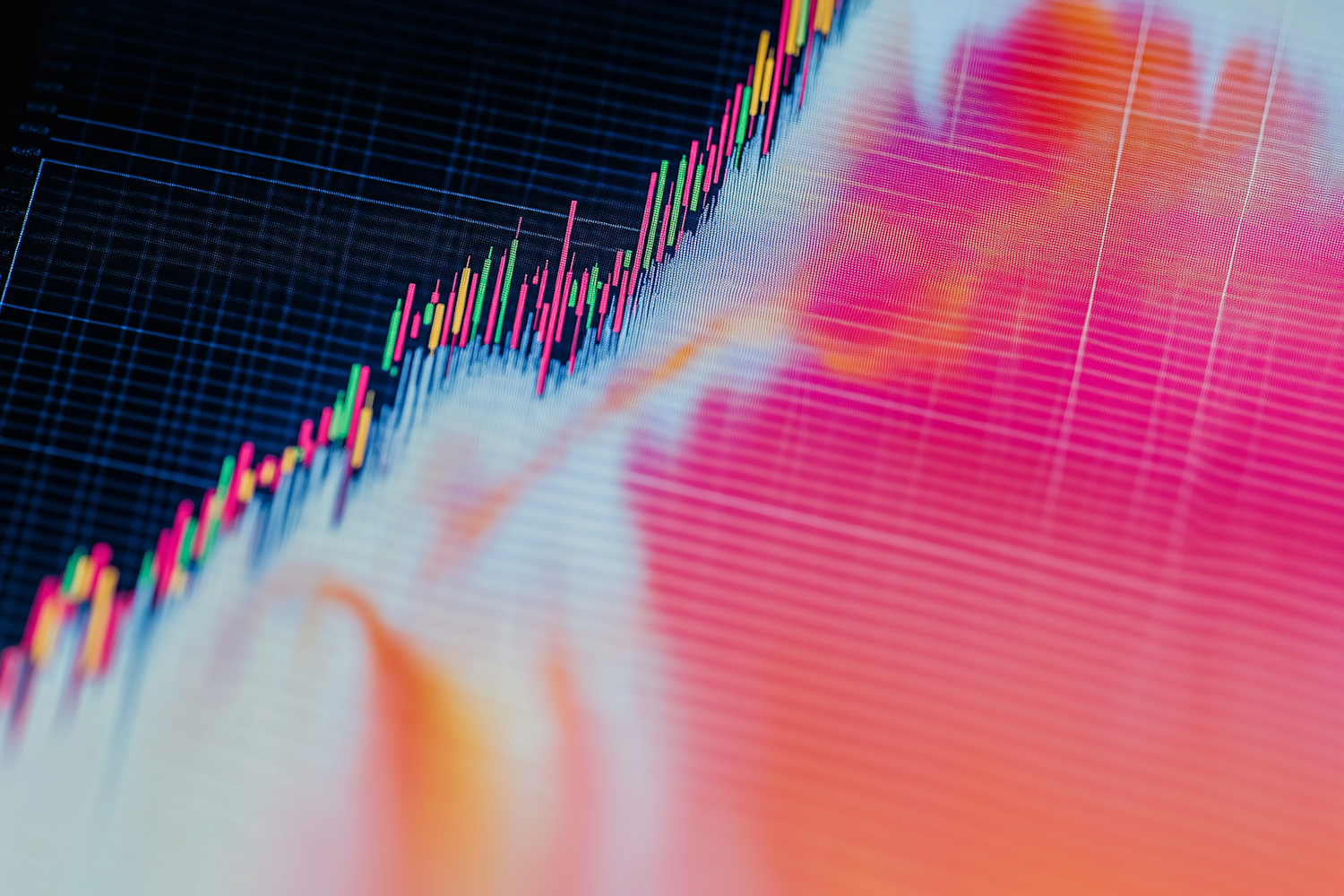 Colorful stock market chart with candlestick patterns on a vibrant pink and orange gradient background, symbolizing financial trends.