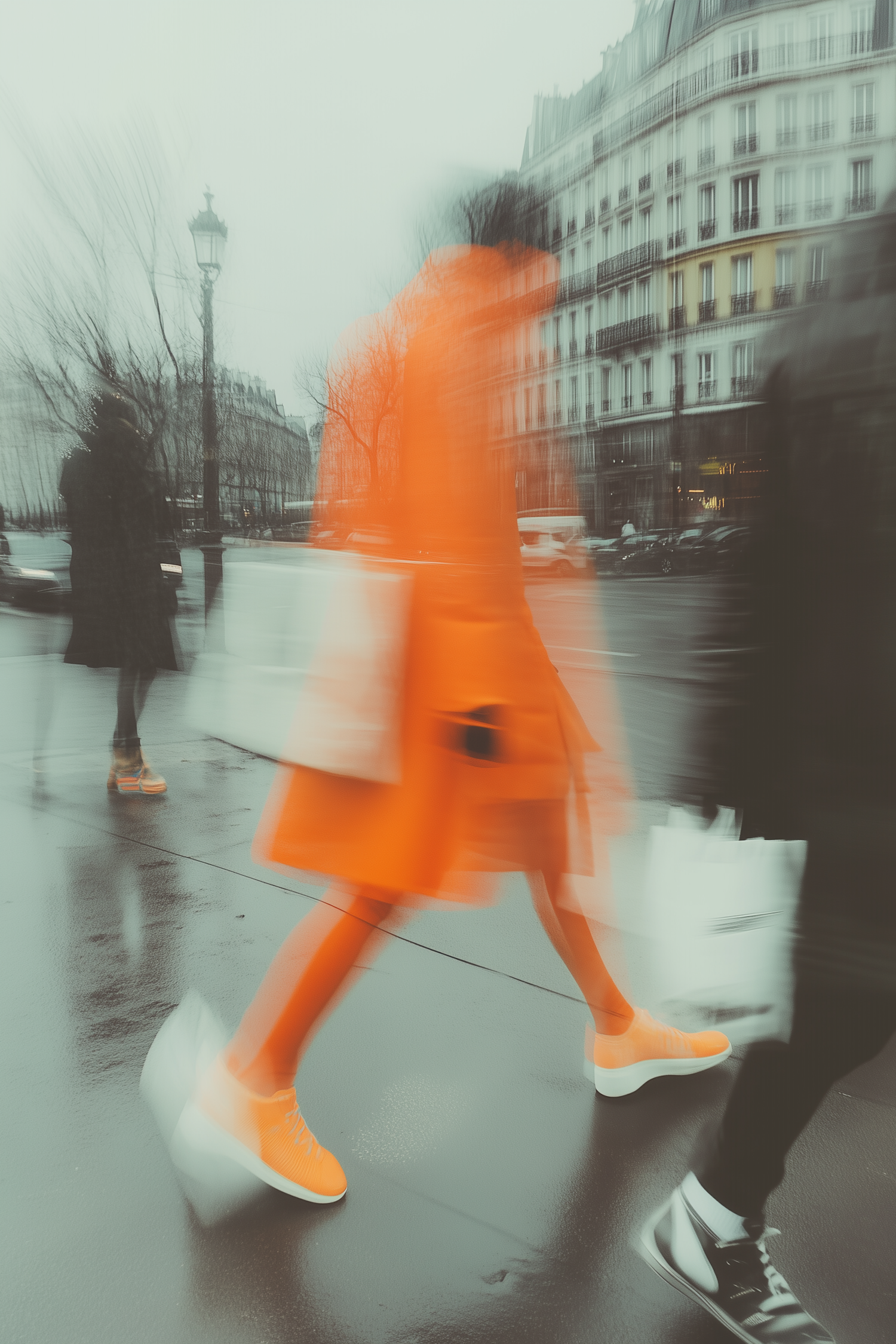Blurred street scene with a person in bright orange walking, creating a dynamic and energetic urban atmosphere.