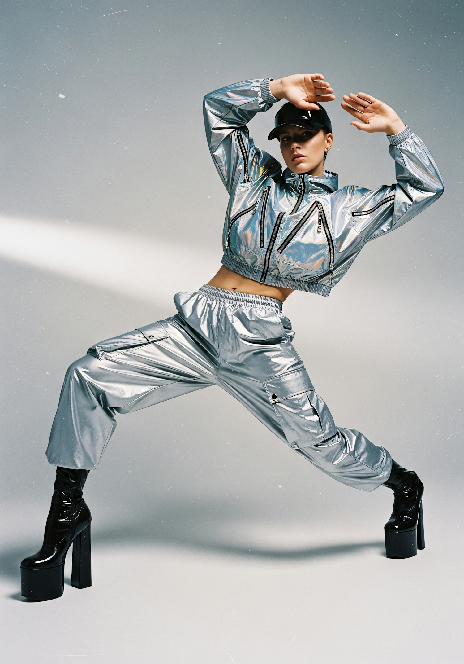 A person in a metallic silver outfit and black boots strikes a dynamic pose in a studio setting, showcasing a futuristic fashion style.