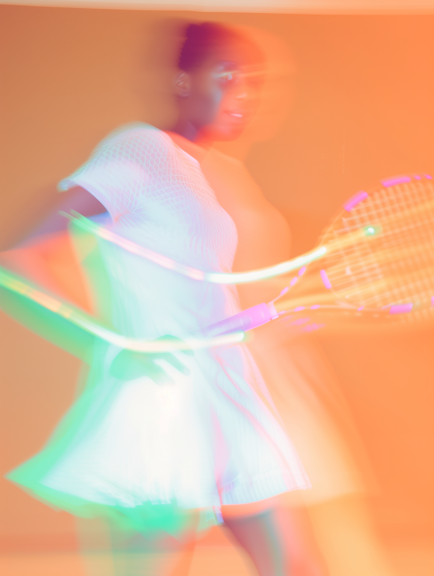 Blurred motion shot of a tennis player in a white outfit, glowing neon hues of orange, green, and pink create a dynamic, energetic vibe.