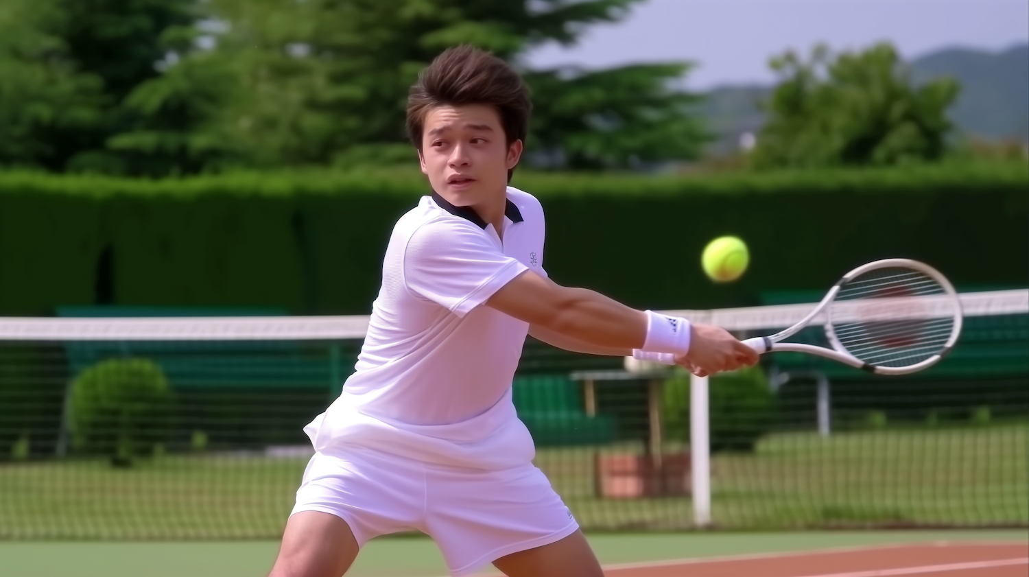 Focused tennis player in white outfit executing a backhand swing on an outdoor court.
