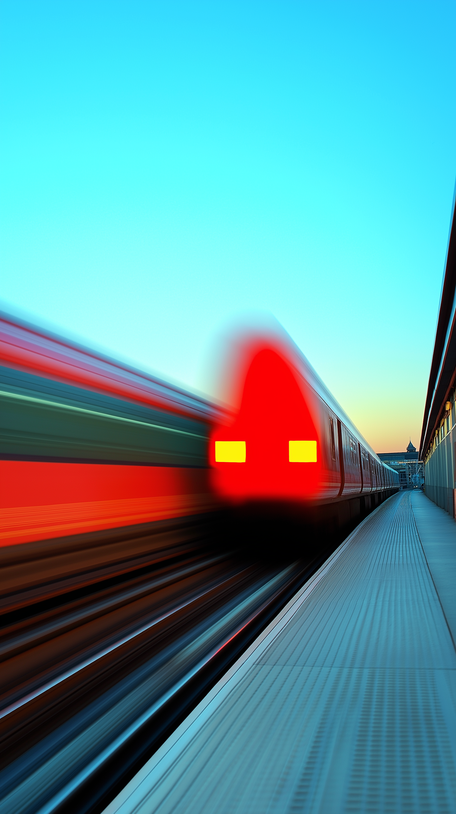 Dynamic image of a high-speed red train in motion, with bright yellow lights, against a clear blue sky and modern platform.