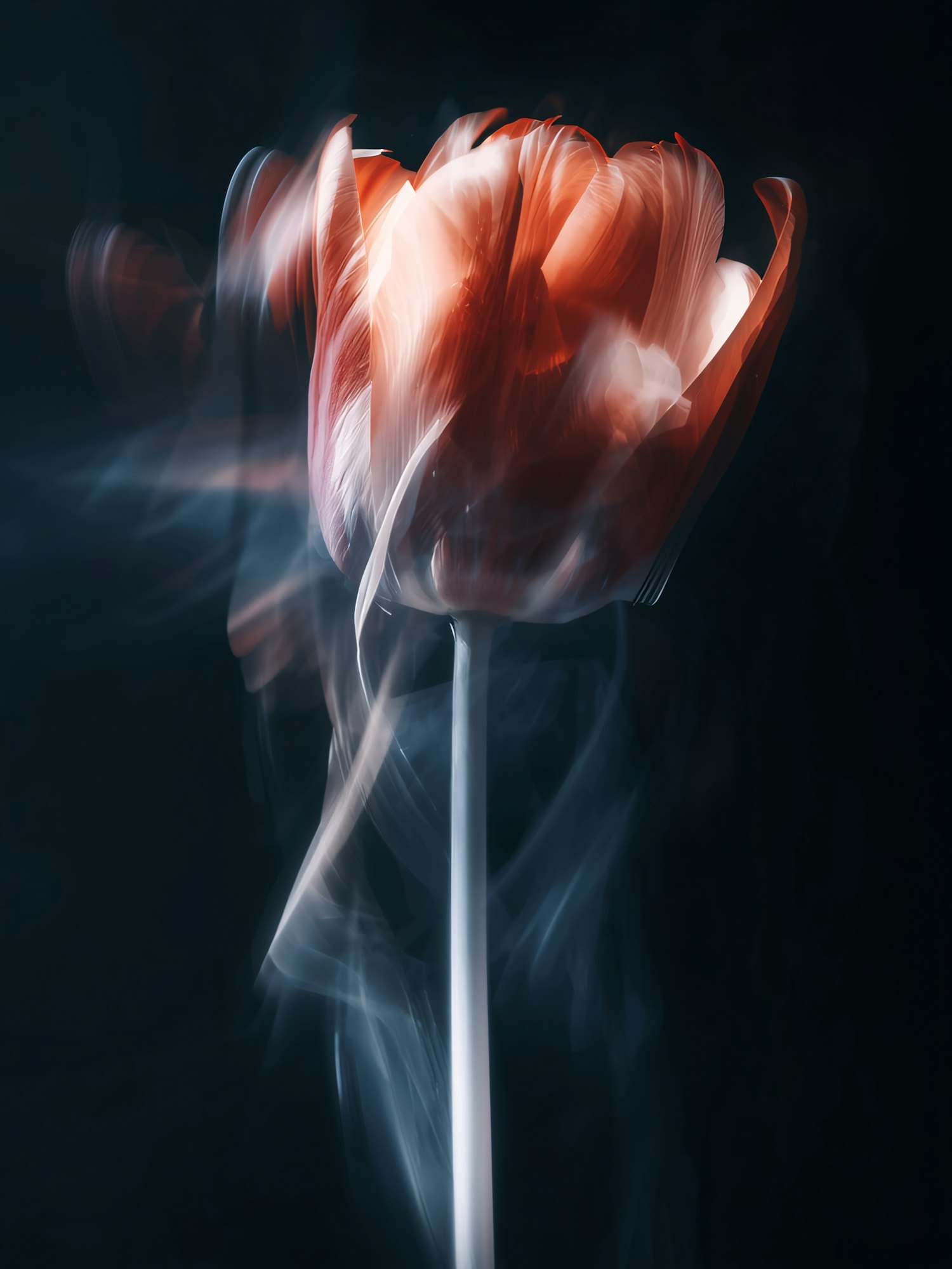 A stunning close-up of a tulip with red and white petals, captured with a motion blur effect against a dark background.