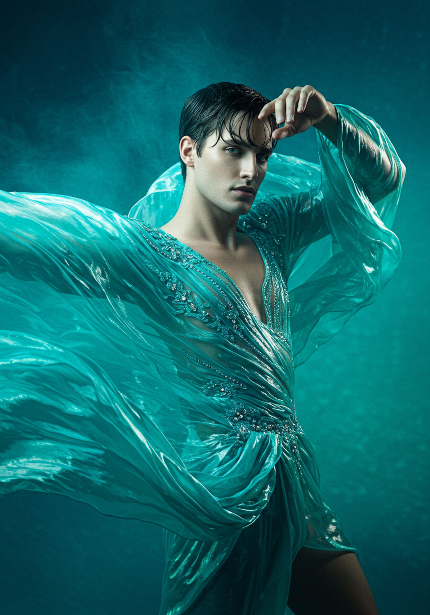 Dramatic portrait of a person in a flowing teal garment with intricate beadwork, set against a teal background, exuding elegance and movement.