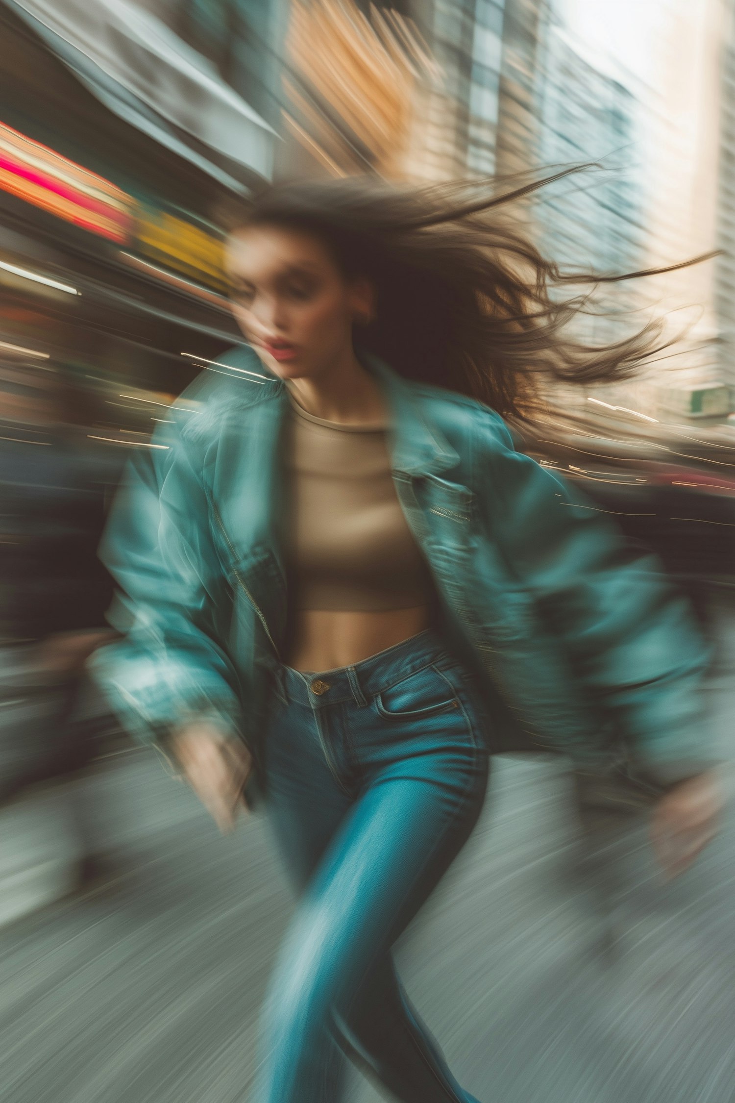 Blurred motion shot of a woman in a teal jacket and jeans, running through a cityscape with dynamic energy and urban vibes.