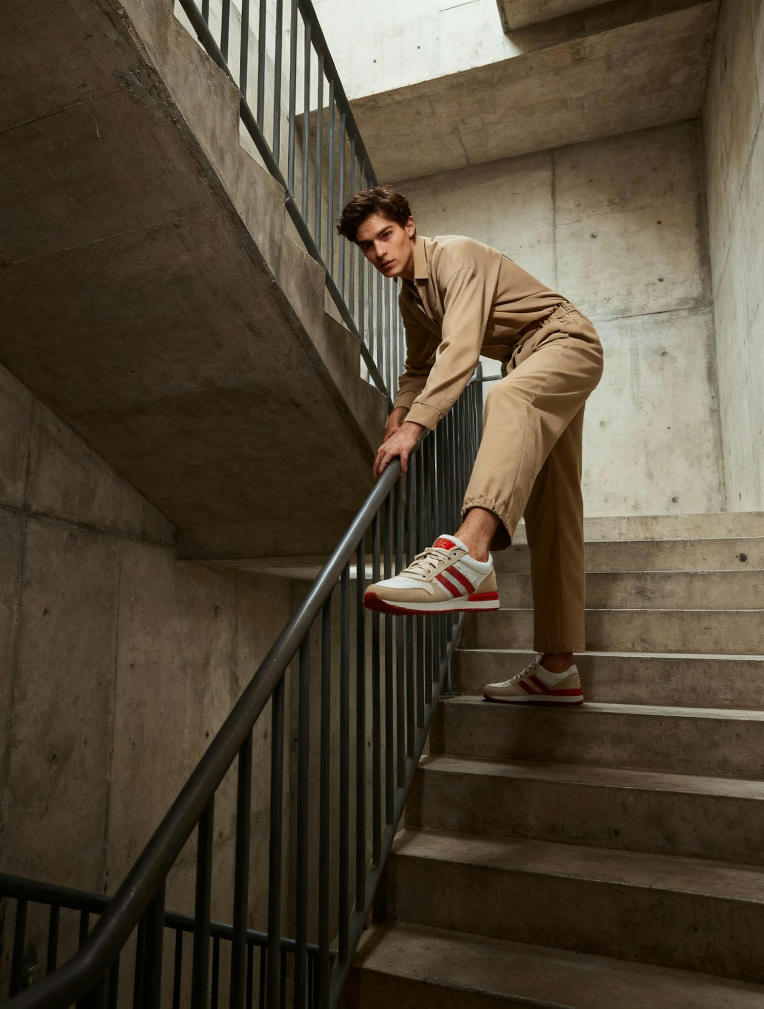 A man in a beige jumpsuit and red-accented sneakers poses dynamically on a concrete staircase in an industrial setting.