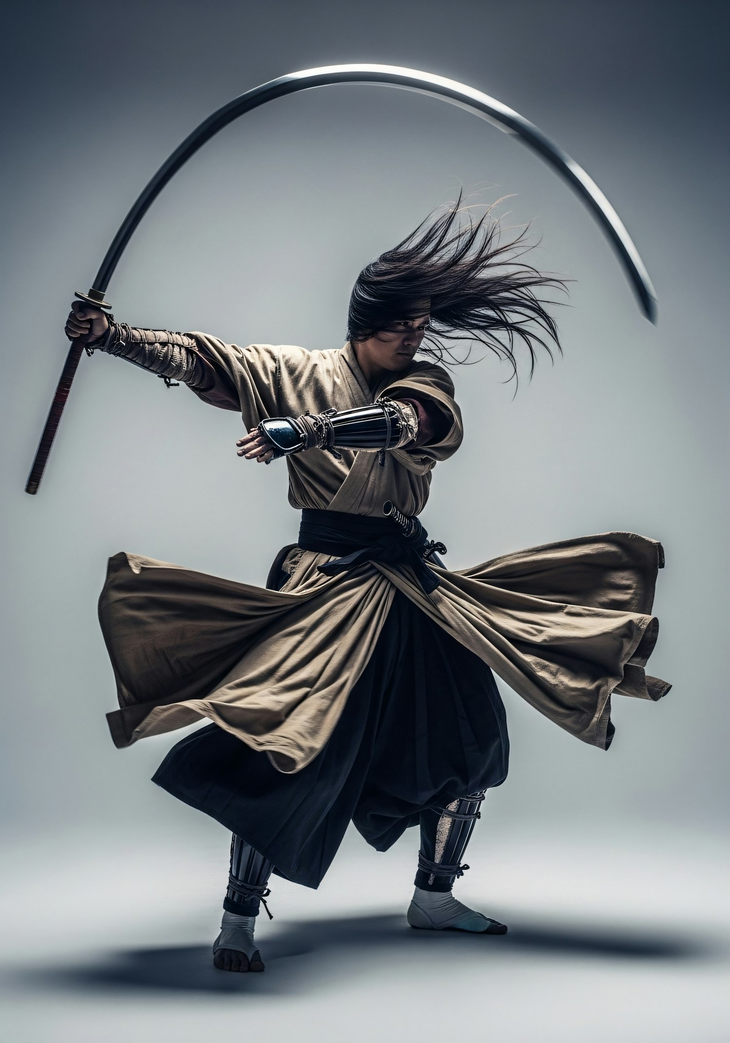 A warrior in traditional attire, mid-action with a curved sword, set against a neutral background, showcasing dynamic motion and dramatic lighting.