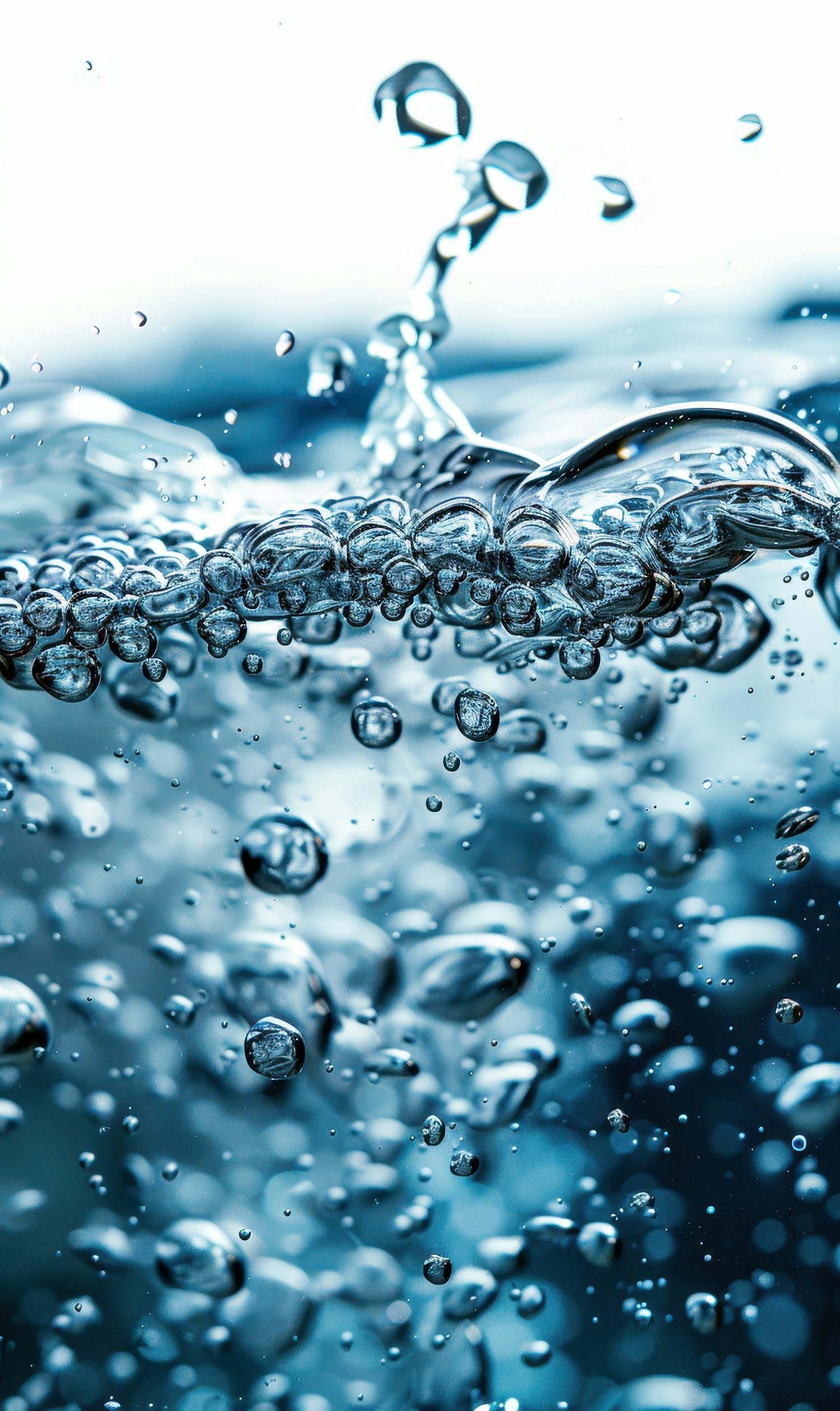 Close-up of water bubbles in motion, with a bluish tint and sparkling highlights, conveying freshness and fluidity.