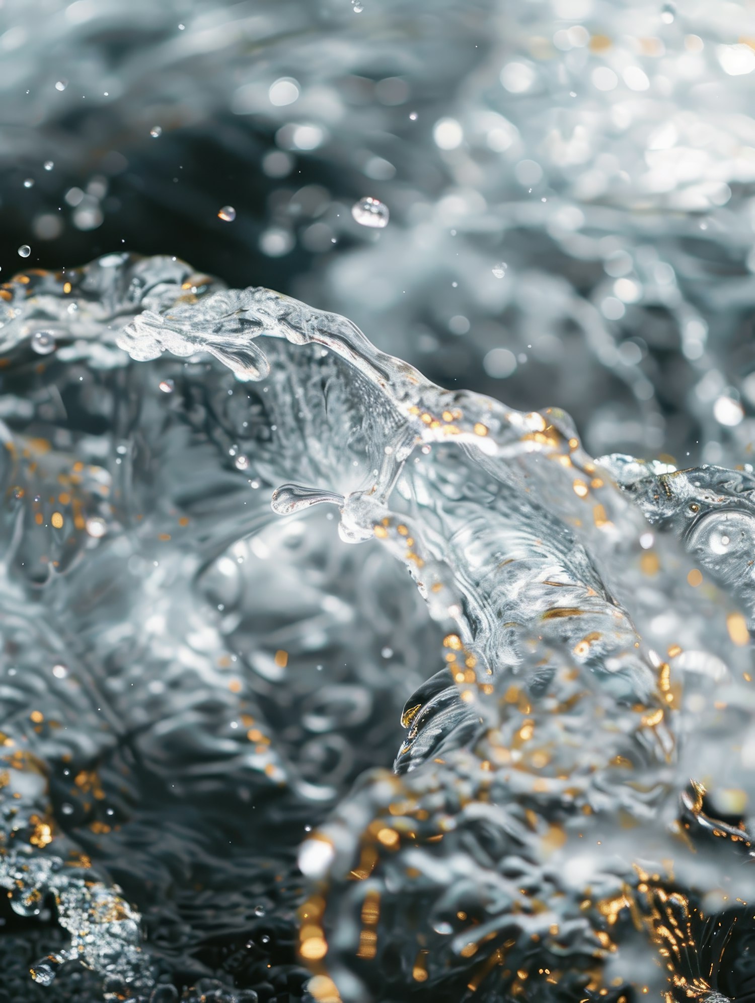 Dynamic close-up of splashing water with silver and golden hues, showcasing intricate ripples and droplets in motion.