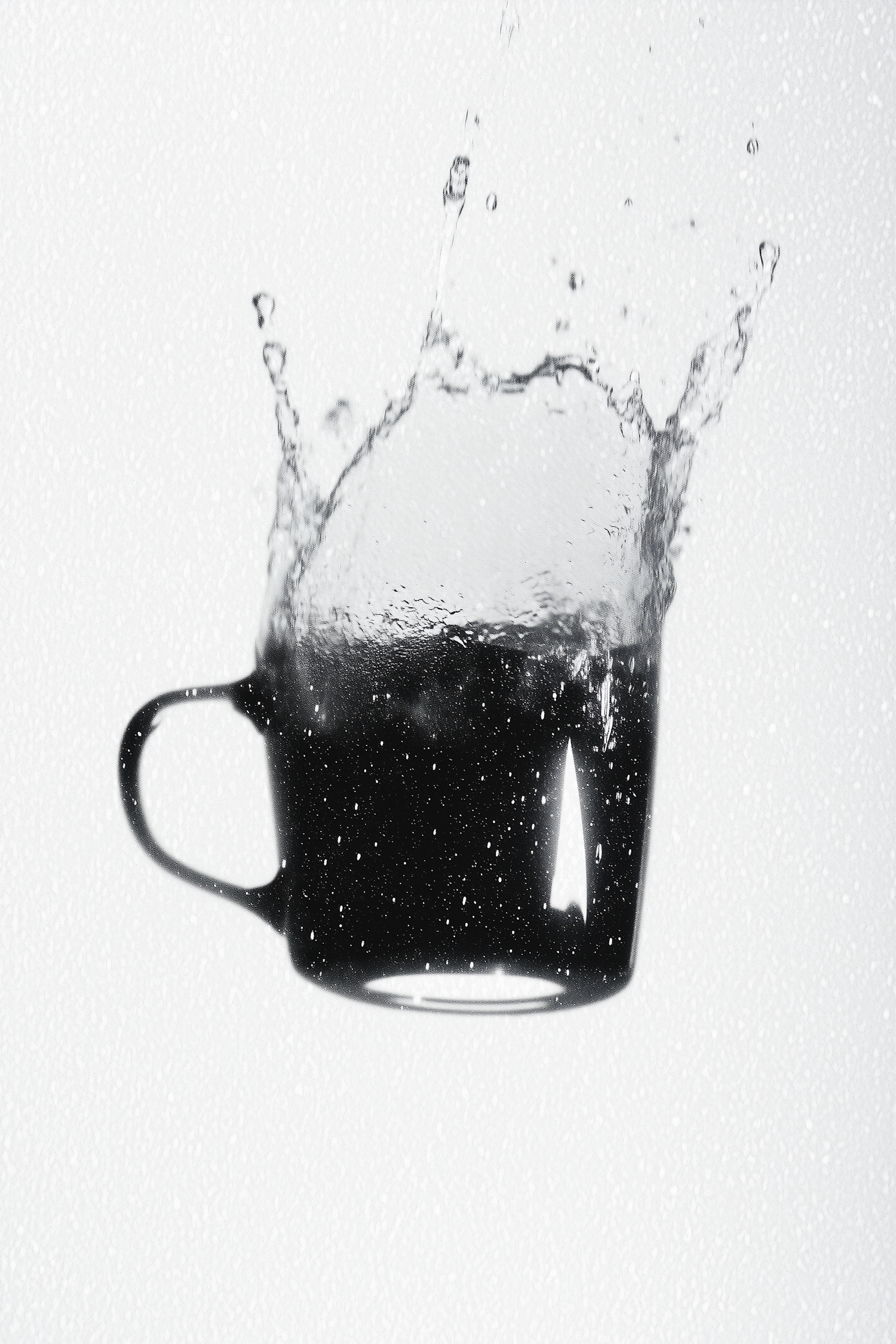 Dynamic shot of a black mug mid-air with water splashing out, set against a clean white background. Perfect for creative and energetic visuals.