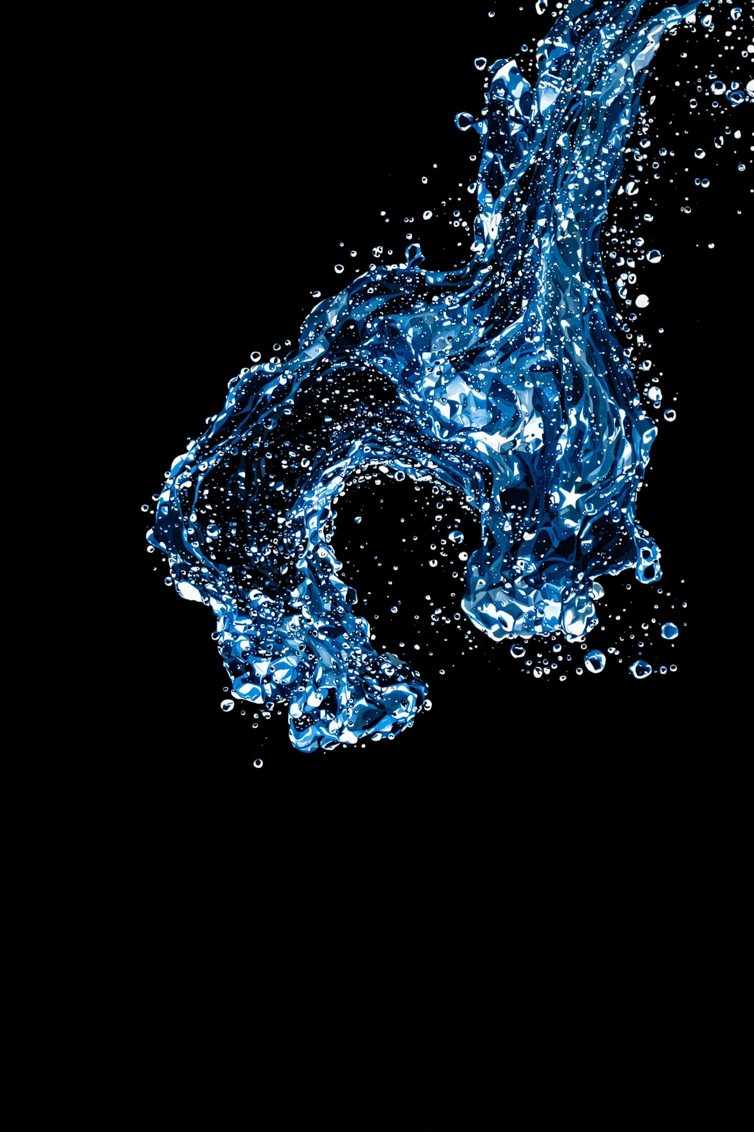 Vivid blue water splash in motion against a black background, with scattered droplets and shimmering light reflections.