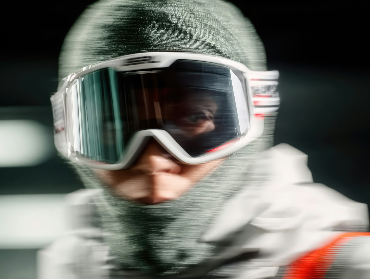 Close-up of a person in a green balaclava and white ski goggles, with a dynamic and slightly blurred effect, suggesting motion.