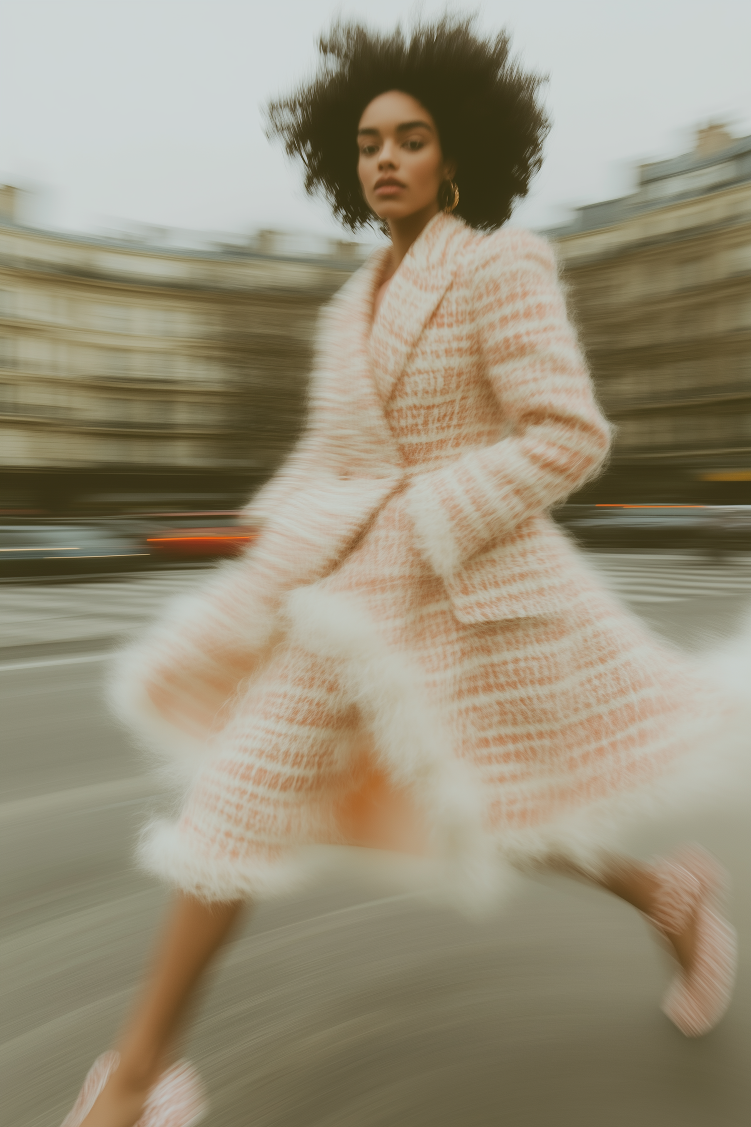 Stylish woman in motion wearing a pink and white textured coat, captured with dynamic blur in an urban setting.